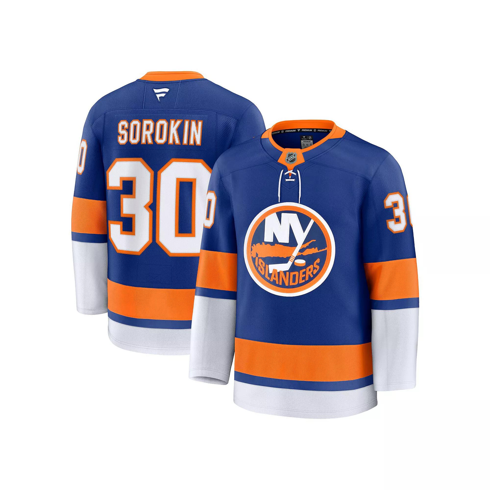 When you're watching the on-ice action, you need a jersey to match. With this New York Islanders Fanatics Home Premium Jersey you get just that! This premium jersey is made for the loyal New York Islanders fan like you and takes inspiration from what your team wears on gameday. Available in traditional colors, this Ilya Sorokin jersey possesses a more adjusted fit and mesh panels to enhance your comfort no matter where you enjoy the game!When you're watching the on-ice action, you need a jersey to match. With this New York Islanders Fanatics Home Premium Jersey you get just that! This premium jersey is made for the loyal New York Islanders fan like you and takes inspiration from what your team wears on gameday. Available in traditional colors, this Ilya Sorokin jersey possesses a more adjusted fit and mesh panels to enhance your comfort no matter where you enjoy the game!PRODUCT FEATURESLong sleeveJersey Color Style: HomeImportedOfficially licensedRounded droptail hem with side ventsBrand: FanaticsMachine wash, tumble dry lowAuthentic tie-down fight strap inside lower backHolographic NHL Shield and embroidered Fanatics flag patchMaterial: 100% Polyester PiqueAll-new neck tape and jock tag designsPremium chassis is not as wide as Authentic Pro jersey, but still larger than Breakaway jerseyFanatics Premium JerseySewn-down tackle twill with embroidered crest and shoulder patches Size: 54. Color: Isl Blue. Gender: male. Age Group: adult.