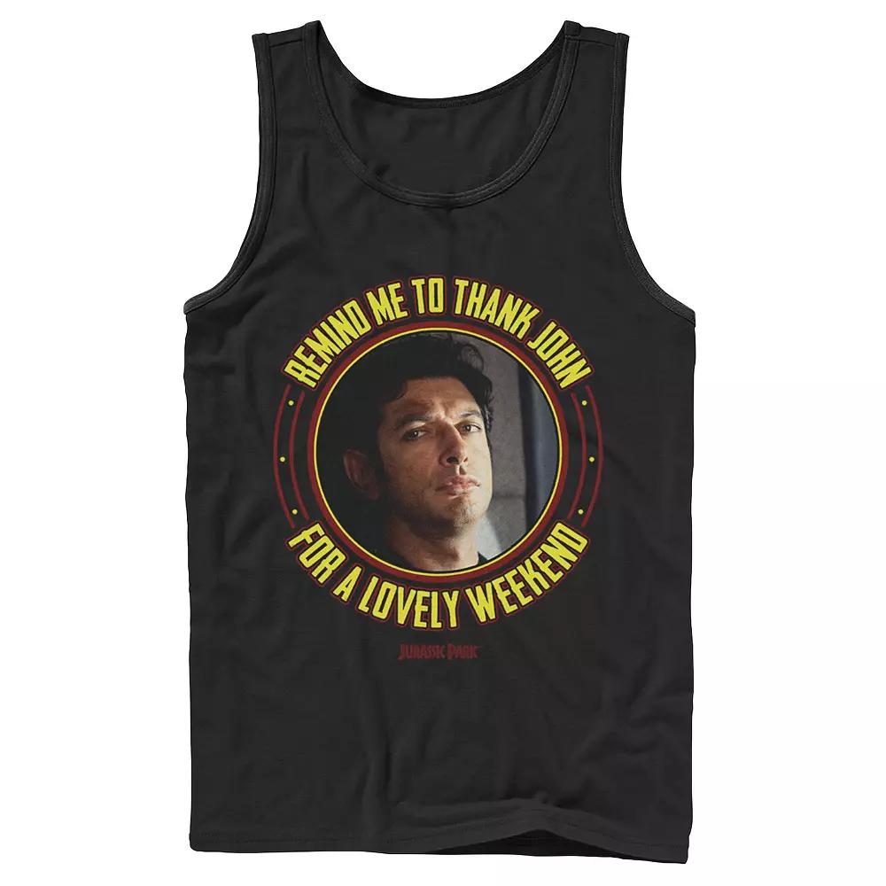 He'll be thankful when you gift him this men's Jurassic Park Remind Me To Thank John For The Weekend Tank Top. He'll be thankful when you gift him this men's Jurassic Park Remind Me To Thank John For The Weekend Tank Top. Printed design SleevelessFABRIC & CARE Cotton Machine wash Imported Color: Black. Gender: male. Age Group: adult. Pattern: Graphic.