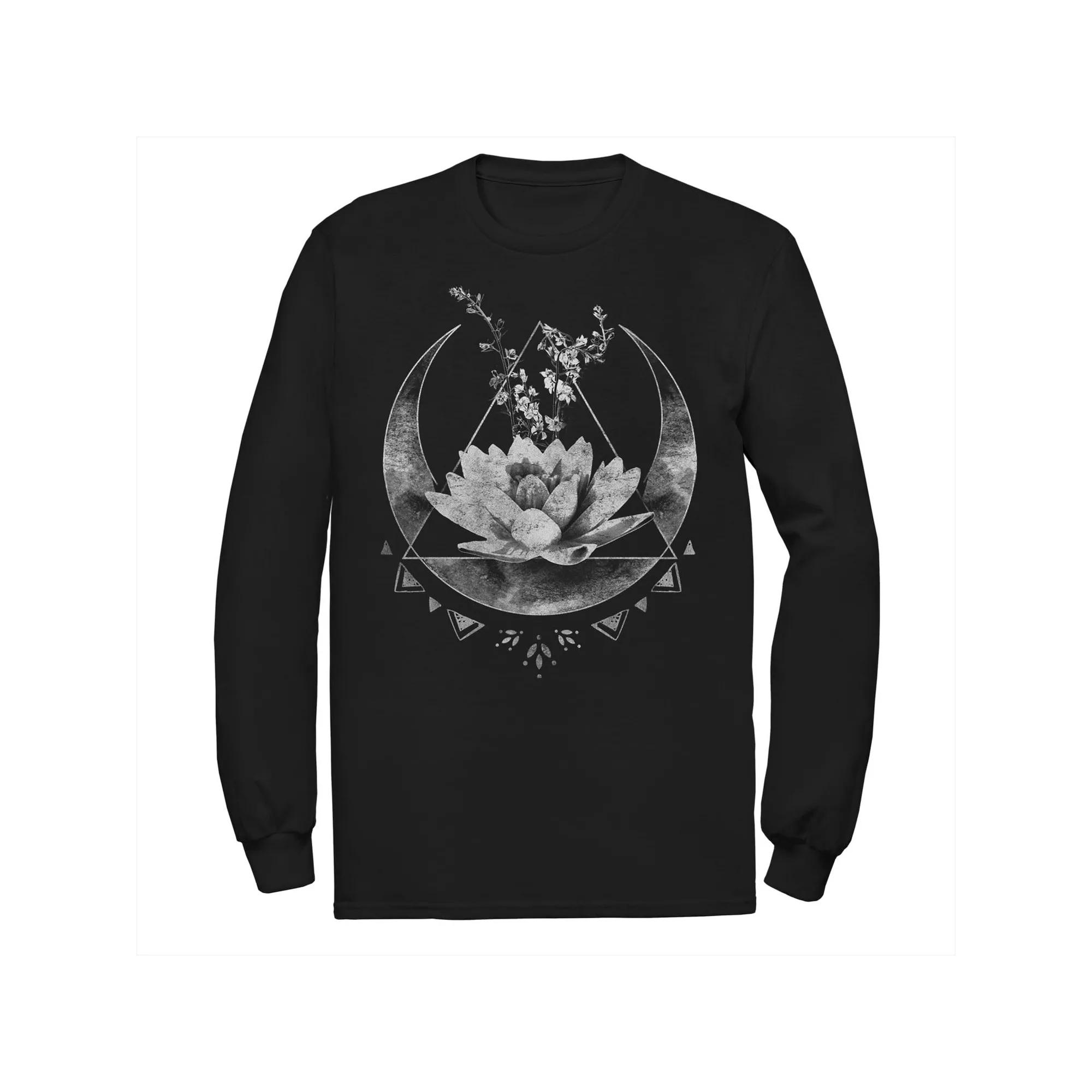 Add celestial appeal to your look with this men's lotus flower moon tee. Add celestial appeal to your look with this men's lotus flower moon tee. FEATURES Crewneck Long sleevesFABRIC & CARE Cotton Machine wash Imported Color: Black. Gender: male. Age Group: adult. Pattern: Graphic. Material: Cotton Blend.