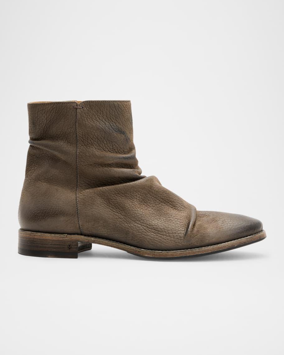 John Varvatos "Morrison Sharpei" ankle boots constructed from natural tumble grain calf leather Stacked heel Almond toe Leather lining Side zip for easy on and off Hand-stained leather sole Professional care by leather expert Imported