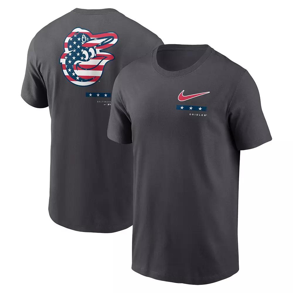 Combine your patriotic spirit with your love for the Baltimore Orioles by sporting this Americana T-shirt by Nike. A classic crew design and soft fabric offer comfort with each wear. Distinct Baltimore Orioles graphics with symbolic touches makes for a spirited layer. Short sleeve. Material: 100% Cotton. Screen print graphics. Officially licensed. Machine wash, tumble dry low. Crew neck. Imported. Brand: Nike. Color: Grey. Gender: male. Age Group: adult.