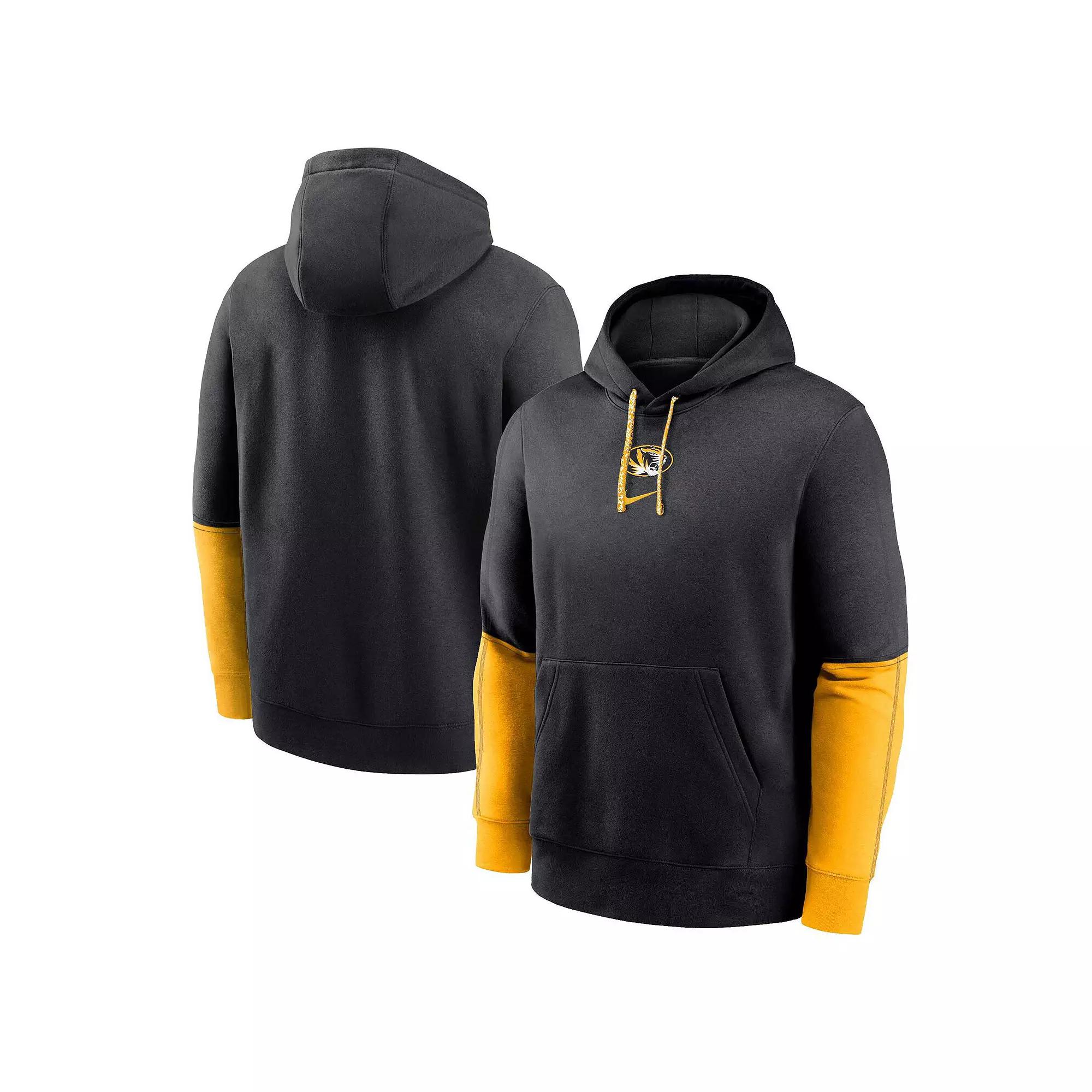 Gear up for the season in cozy comfort with this Missouri Tigers Sideline Club Fleece Pullover Hoodie from Nike. This official piece of sideline outerwear features a fleece lining for added warmth, making it perfect for cheering on the Missouri Tigers during those chilly game days. The embroidered team logo on the front proudly displays your allegiance.Gear up for the season in cozy comfort with this Missouri Tigers Sideline Club Fleece Pullover Hoodie from Nike. This official piece of sideline outerwear features a fleece lining for added warmth, making it perfect for cheering on the Missouri Tigers during those chilly game days. The embroidered team logo on the front proudly displays your allegiance.PRODUCT FEATURESMaterial: 80% Cotton/20% Polyester - Body; 100% Cotton - Hood LiningHoodedMachine wash, tumble dry lowLong sleeveImportedOfficially licensedMidweight hoodie suitable for moderate temperaturesPulloverBrand: NikeFront pouch pocketSame outerwear worn by the players, coaches and team staffTeam logo embroidered at top center chestFleece lining provides added warmth Color: Black. Gender: male. Age Group: adult.