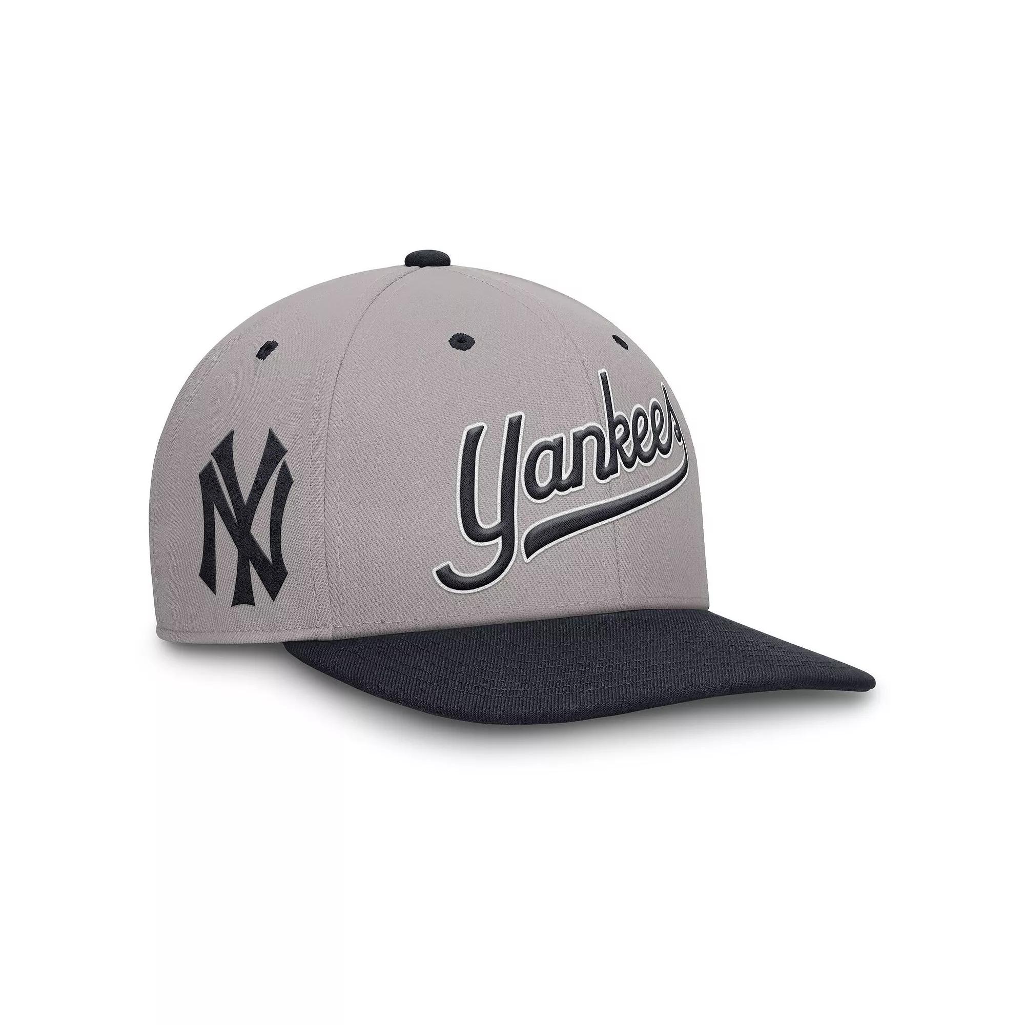 Featuring a flat bill and high crown, this Cooperstown Pro Hat helps you display support for the New York Yankees with a vintage 2-tone design and throwback team embroidery. Its sweat-wicking technology and snapback closure help provide a breathable, comfortable feel. Benefits:Nike Dri-FIT technology moves sweat away from your skin for quicker evaporation, helping you stay dry and comfortable. Snapback closure provides a customizable fit. Product Details:6-panel design. Embroidered eyelets. 100% polyester. Hand wash. Imported. Style: NB13196RN27; Color: Grey; Size: One Size; Gender: Male; Age Group: Adult | New York Yankees Cooperstown Pro Mens Nike Dri-FIT MLB Adjustable Hat in Grey, Size: One Size | NB13196RN27-7C5