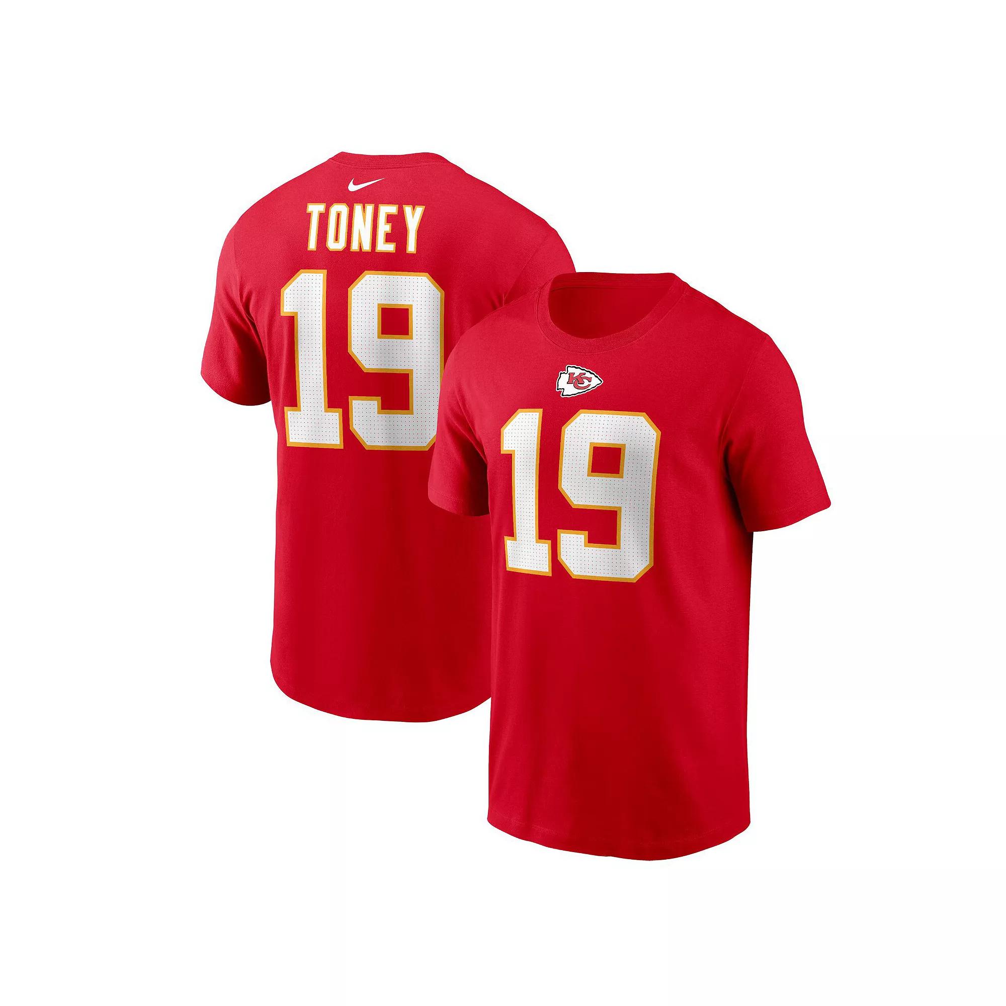 Kadarius Toney is consistently one of the most dominant players on the gridiron. This Player Name and Number T-shirt from Nike is a strong tribute to your favorite players career with the Kansas City Chiefs. Designed as a simple alternative to the on-field jerseys, this player tee features bold graphics on the front and back so you can proudly support your Kansas City Chiefs.Kadarius Toney is consistently one of the most dominant players on the gridiron. This Player Name and Number T-shirt from Nike is a strong tribute to your favorite players career with the Kansas City Chiefs. Designed as a simple alternative to the on-field jerseys, this player tee features bold graphics on the front and back so you can proudly support your Kansas City Chiefs.PRODUCT FEATURESBrand: NikeMaterial: 100% CottonShort sleeveScreen print graphicsImportedMachine wash, tumble dry lowOfficially licensedCrew neck Color: Red. Gender: male. Age Group: adult.