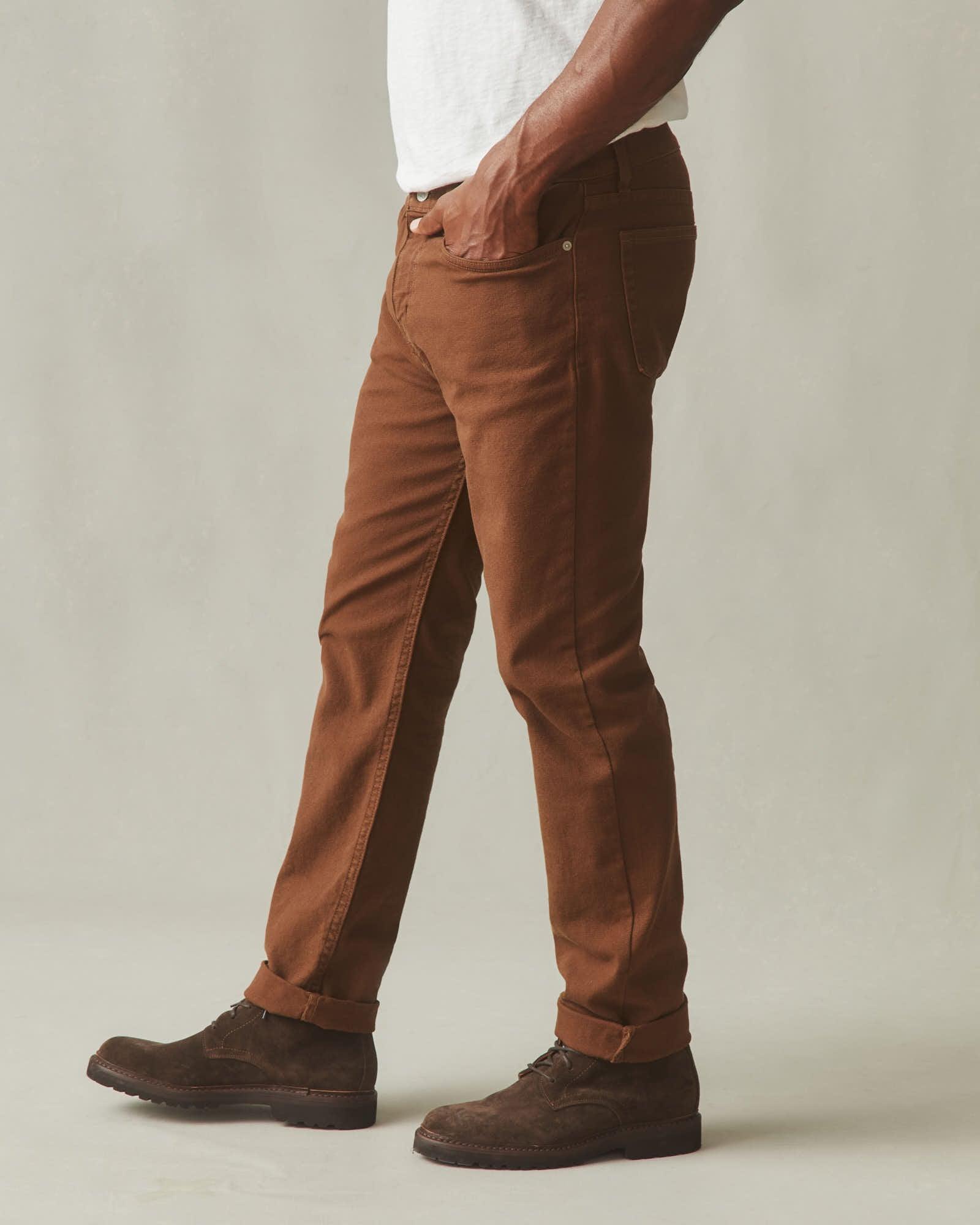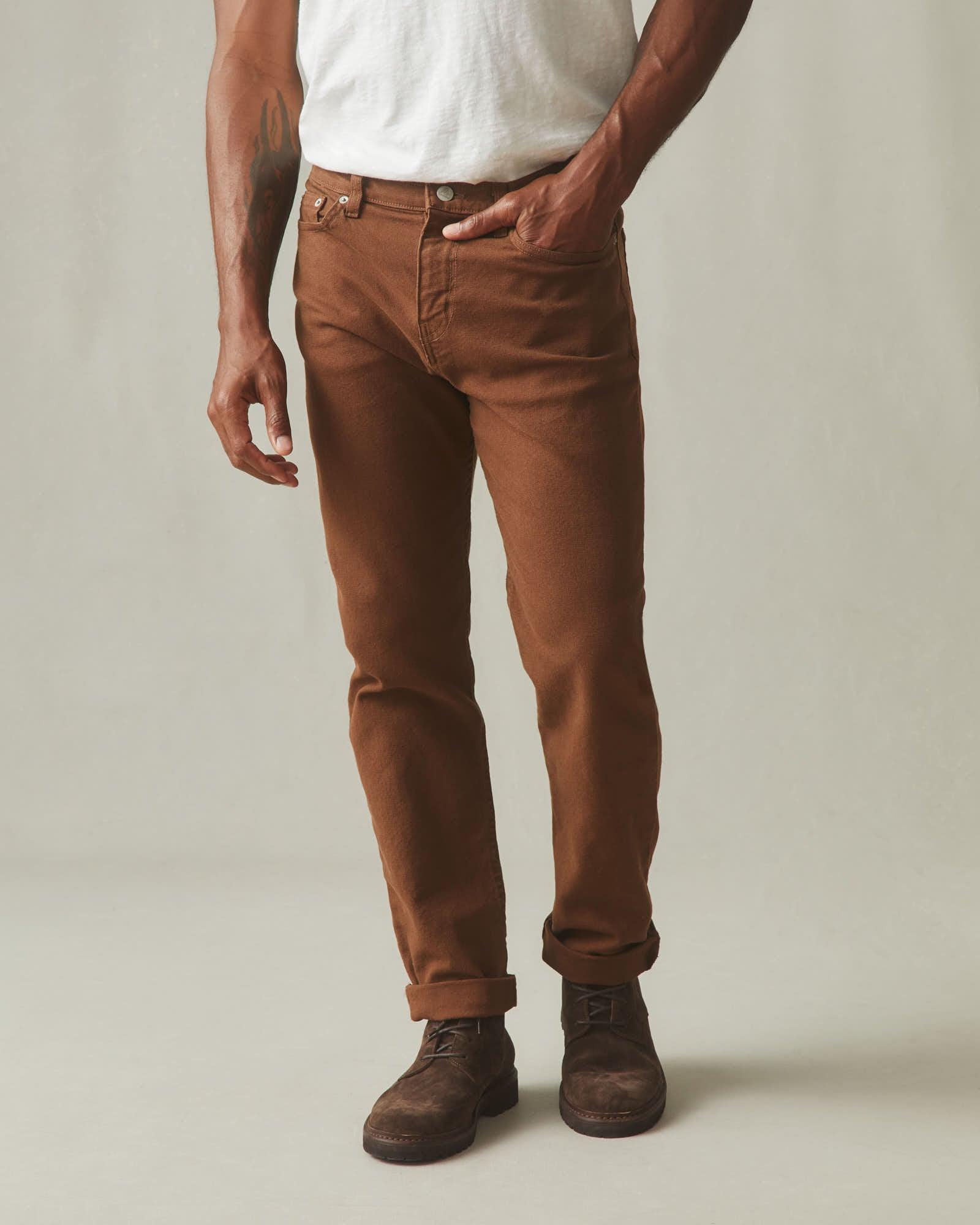 The canvas work pant, updated for today. Made from rugged cotton canvas, but cut like a 5-pocket jean with added stretch for mobility and fit. Our Roughneck Pant is durable, but comfortable and ready to wear from day one-–no breaking in required. Finished with heavy stitching and custom metal hardware.