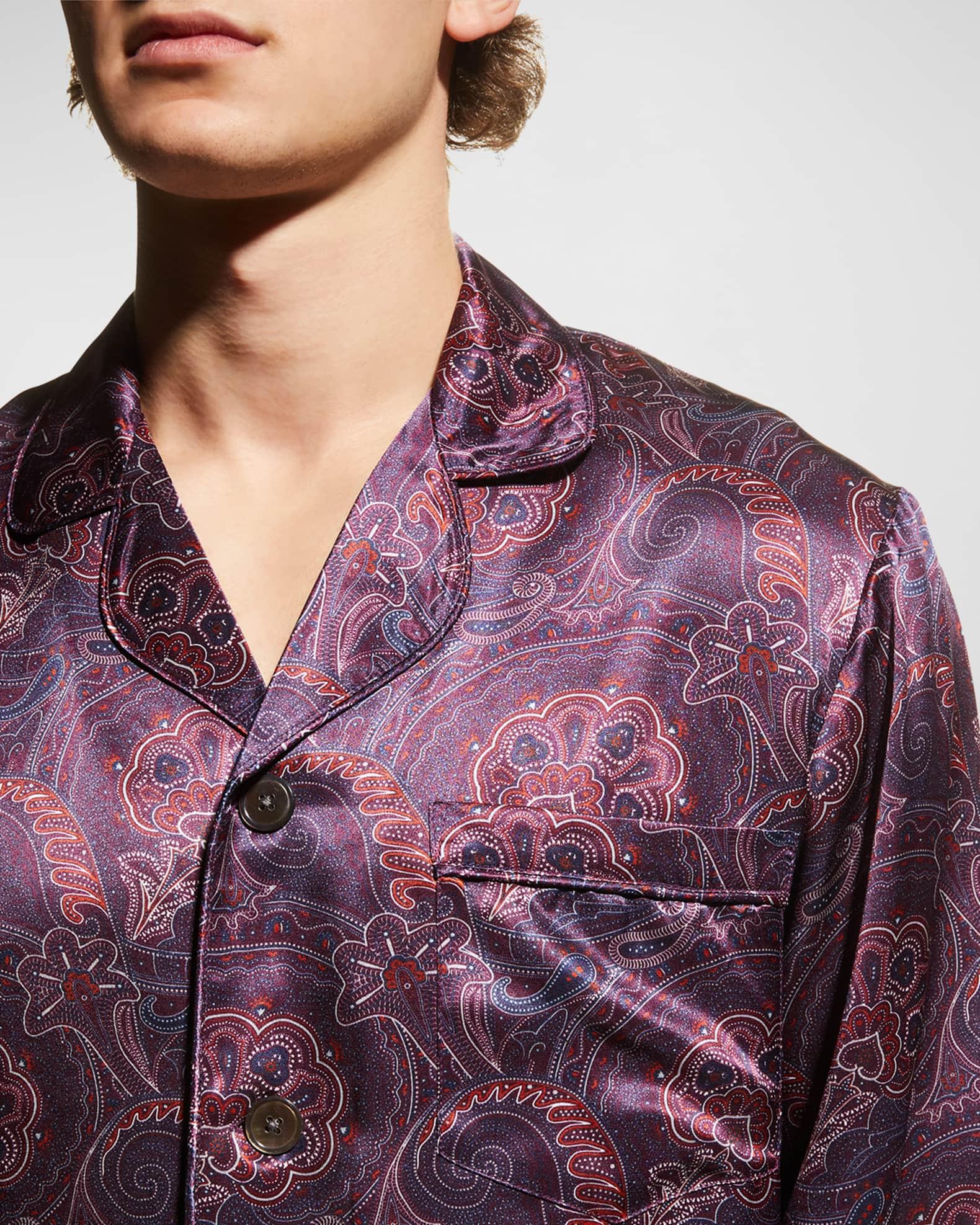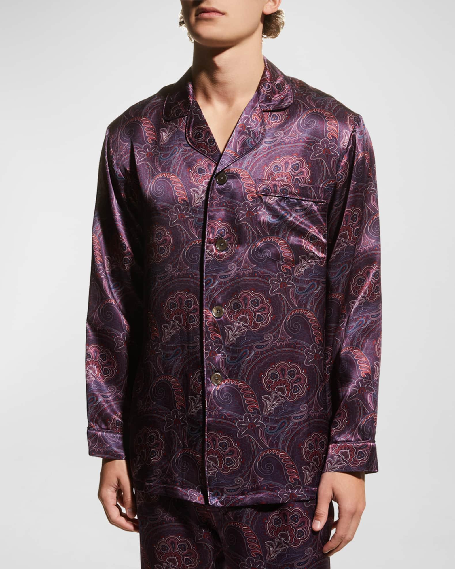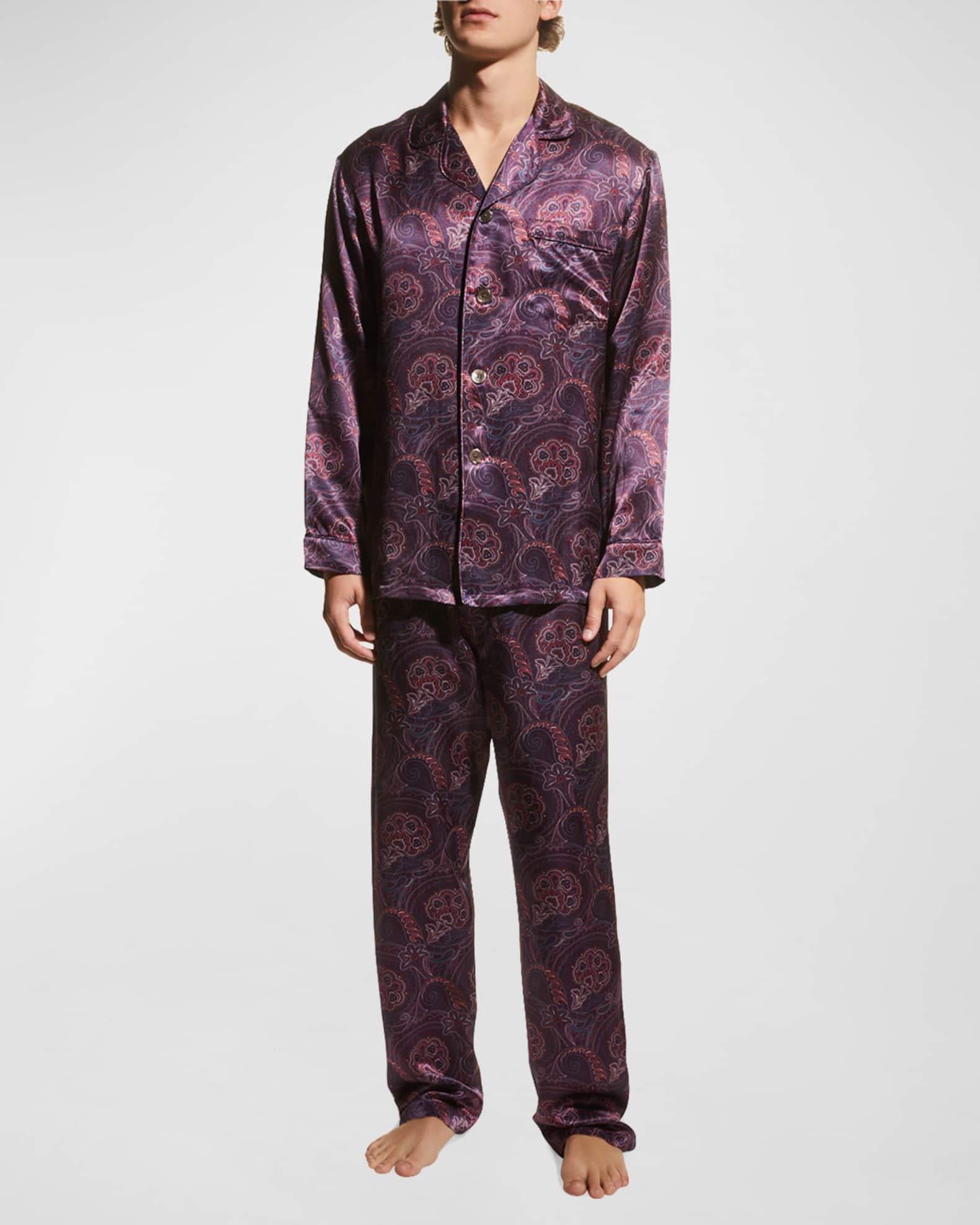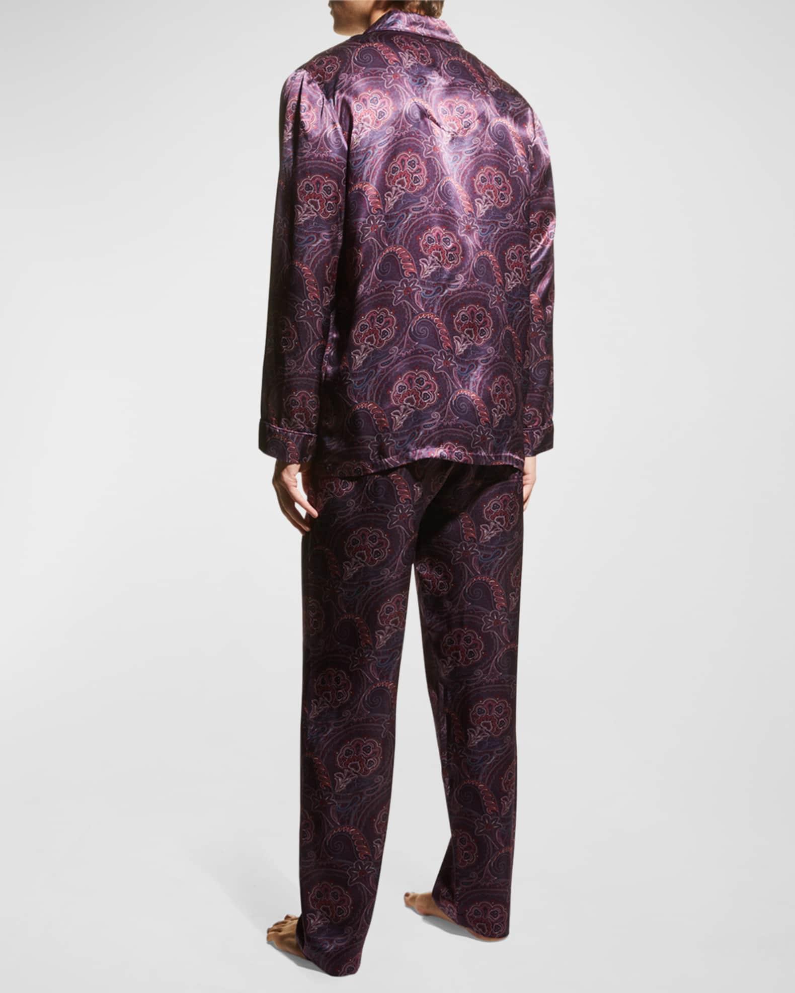 Majestic International pajama set in elegant paisley print Notched lapels; button placket Patch pocket at chest Long sleeves Elasticized drawstring waist Hidden button fly Straight legs Relaxed fit Silk Dry clean Imported Model is 6'1"/185cm.