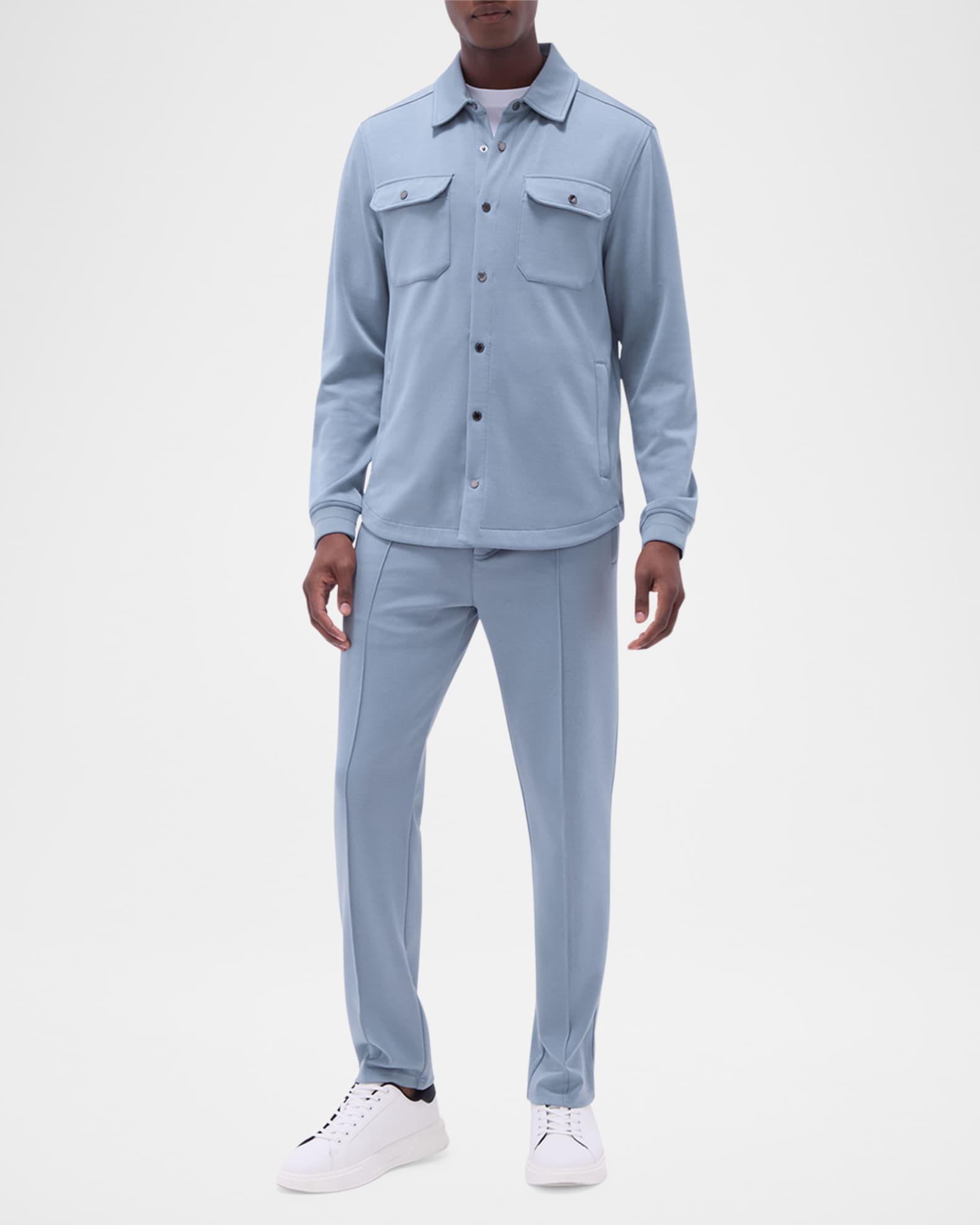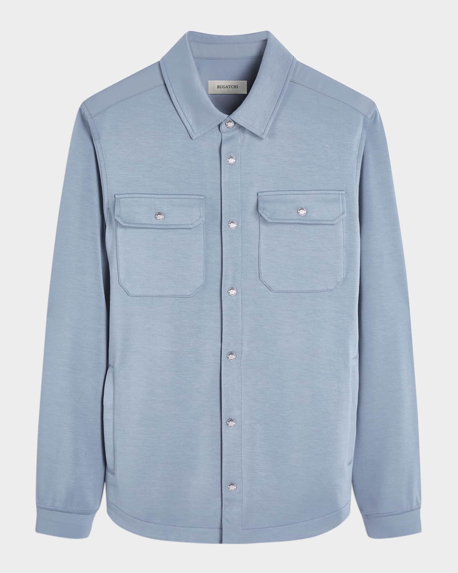 Bugatchi shirt jacket in a soft heathered blend for a dimensional finish Spread collar Button placket Chest flap pockets Side welt pockets Long sleeves Back yoke Curved hem Rayon/cellulose acetate/polyester/spandex Machine wash cold Imported