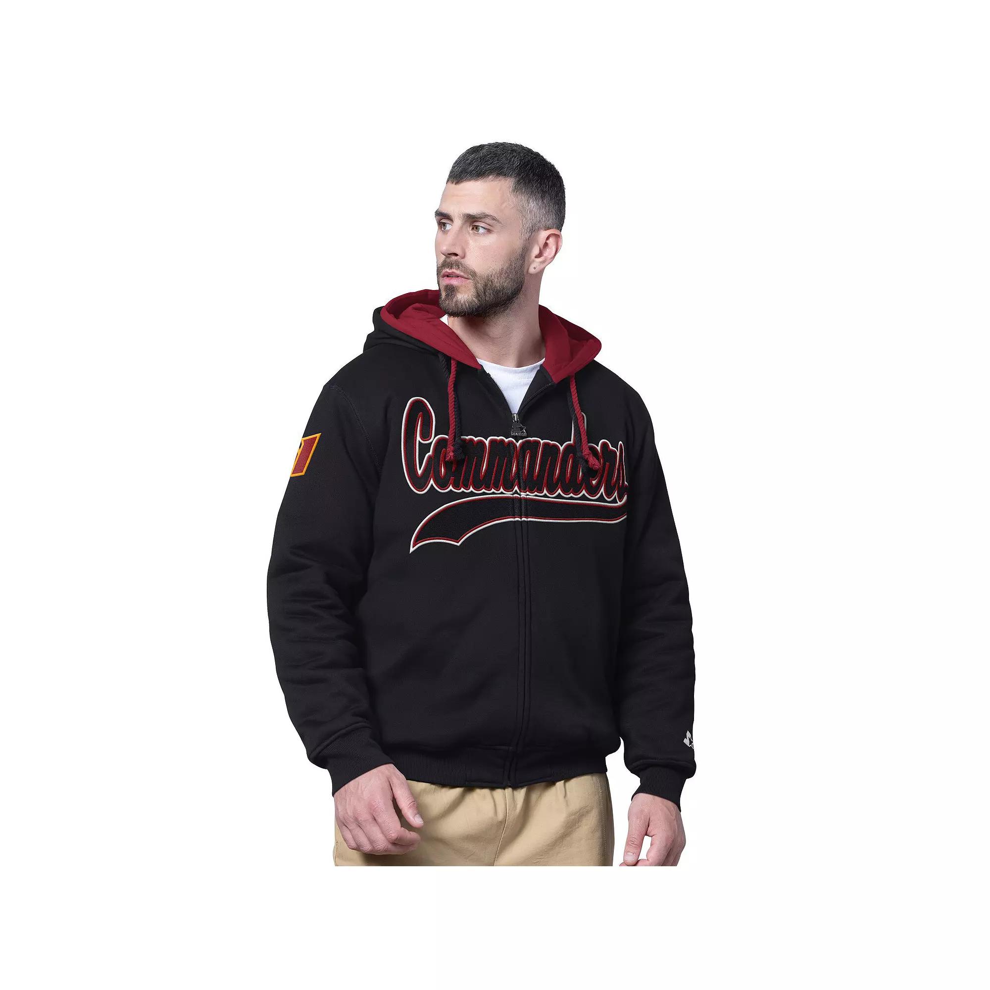 Be prepared for the elements as you head out the door with this Washington Commanders Big Shot Full-Zip Double Hoodie from Starter. Two hoods with adjustable drawstrings provide full coverage, making it perfect for chilly or windy conditions. The twill applique team logo on the right sleeve and embroidered wordmark across the chest will have you ready for Washington Commanders kickoff wherever you'll be taking in the game. Brand: Starter. Rib-knit cuffs and hem for a snug fit that stays in place. Midweight hoodie suitable for moderate temperatures. Double hood with adjustable drawstrings for full coverage. Machine wash, tumble dry low. Fashionable Starter zipper pull that's easy to open and close. Long sleeve. Full Zip. Imported. Officially licensed. Twill applique team logo on right sleeve and embroidered wordmark across the chest. Hooded. Material: 80% Cotton/20% Polyester - Shell; 100% Polyester - Lining; 100% Polyester - Filler; 100% Polyester - Knit. Fleece lining adds softness and warmth. Inside Pockets first opened and second zippered for extra security. Size: XL. Color: Wft Black. Gender: male. Age Group: adult.
