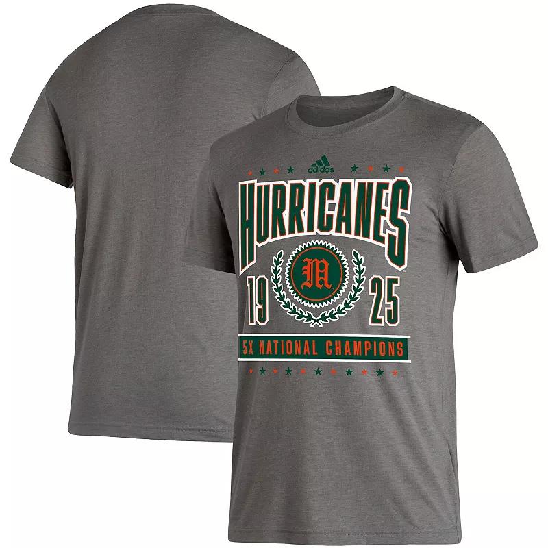Reminisce about your favorite Miami Hurricanes moments with this adidas T-shirt. A classic tee construction and comfy heathered fabric provide a comfortable fit and feel. Plus, the commemorative 5X National Champions graphics spotlight your favorite university in a true team fashion.