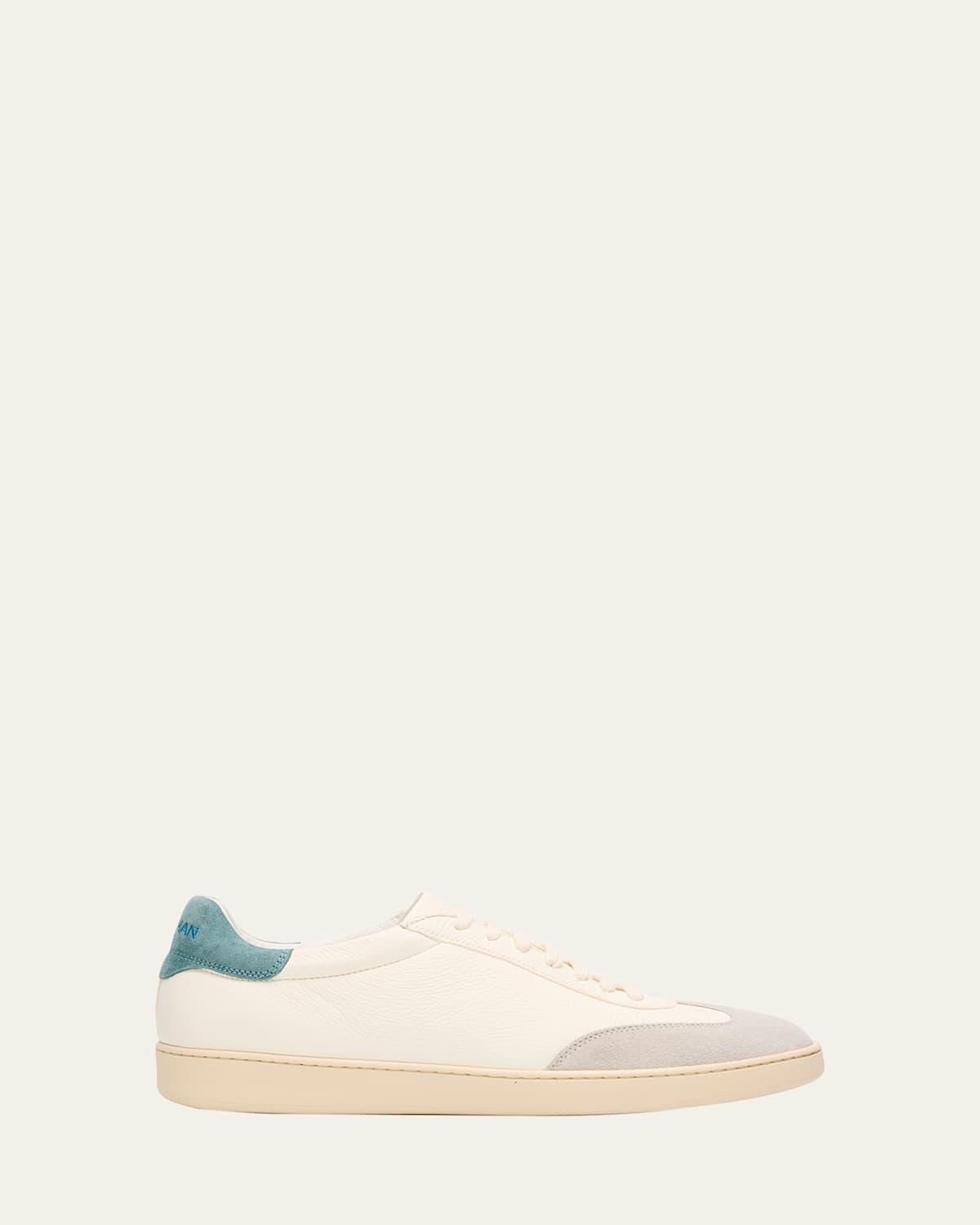 Stuart Weitzman Banner lowtop sneakers in grained leather with suede accents 0.50 in / 15 mm flat heel Round Ttoe Laceup vamp Tongue with debossed logo Leather lining Tonal embroidered backstay logo Rubber outsole Professional cleaning recommended, spot clean Made in Italy