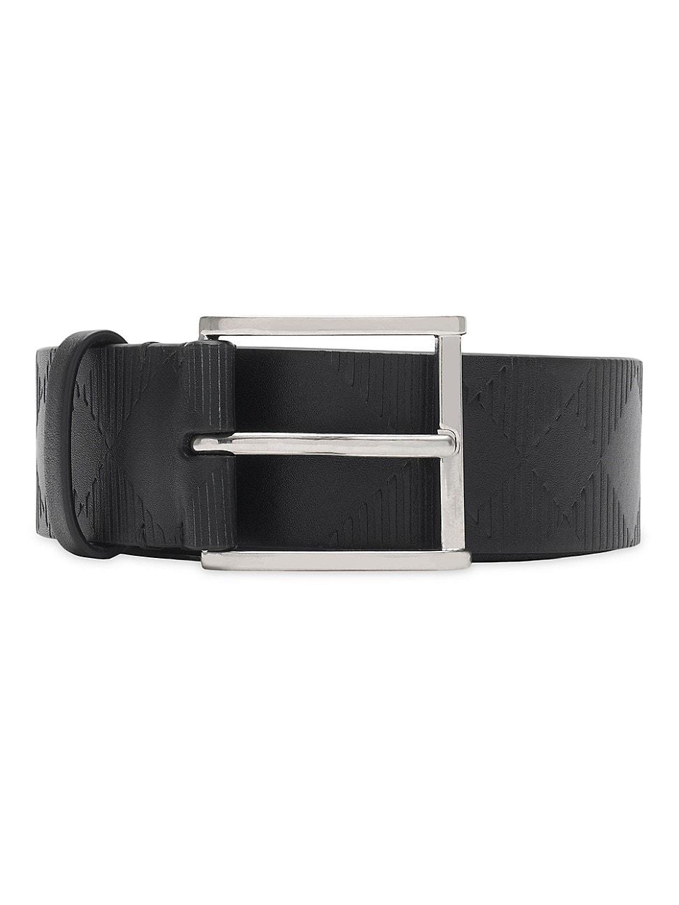 This Italian-made belt is crafted of smooth leather, embossed with the Burberry check, and finished with a palladium-plated buckle. Completed with hand-painted edges, this piece comes with a dust bag. Palladium-plated buckle Comes with a dust bag 100% leather Made in Italy SIZE About 1.5 width ABOUT THE BRAND Founded in 1856 by 21-year-old Thomas Burberry, the brand set out with a mission to stylishly protect against British weather-and Burberrys iconic trench coat was born. In the 1920s, its renowned check pattern was introduced as the coats lining. Today, under Creative Director Daniel Lee, the heritage brand continues to evolve and create timelessly classic mens, womens and kids pieces, along with beauty. Men Accessories - Designer Accessories > Burberry > Saks Fifth Avenue > Barneys. Burberry. Color: Black. Size: 38.