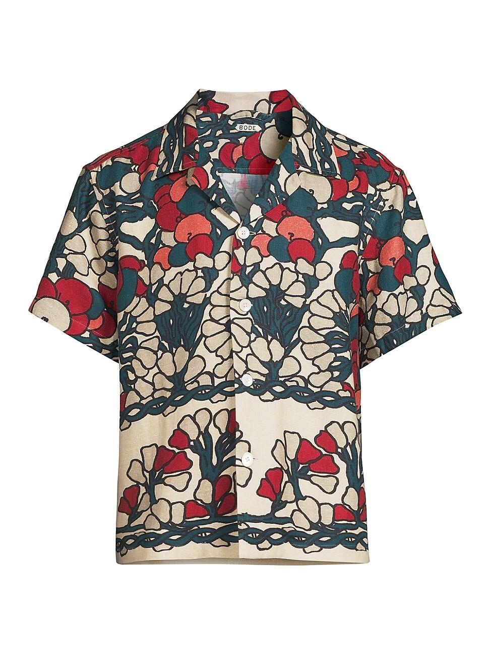 From the Crane Estate Collection. Bodes Garden Lattice short-sleeve shirt exudes timeless elegance and intricate craftsmanship with a graphic block floral motif. Crafted of linen, this button-front style offers an elevated look. Camp collar Short sleeves Button-front closure 100% linen Dry clean Imported SIZE & FIT About 26.25 from shoulder to hem Model measurements: 61 tall, 37 chest, 30.5 waist Model is wearing a US size Medium. Mens Adv Contemporary - Mens Emerging Designer > Bode > Saks Fifth Avenue > Barneys. Bode. Color: Ecru Multi. Size: Small.