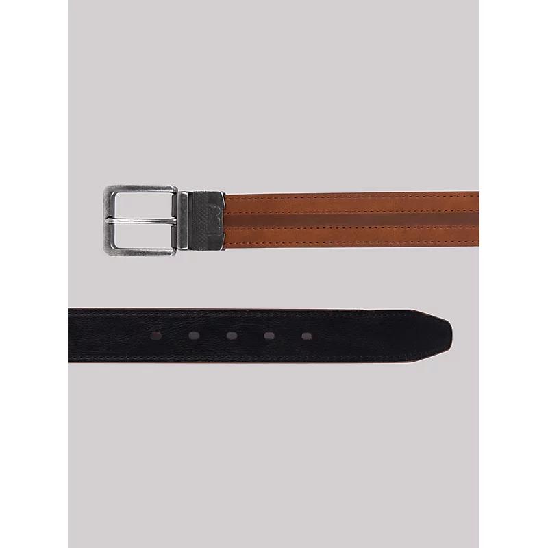 This reversible belt brings versatility mixed with a subtle edge. Its embossing adds dimension without taking over, while the reversible strap flips from rich cognac to classic black with ease. Perfect for dressing up or down, it’s a belt that adapts to your day, no matter your needs. Polyurethane. Cognac/Black. 40.