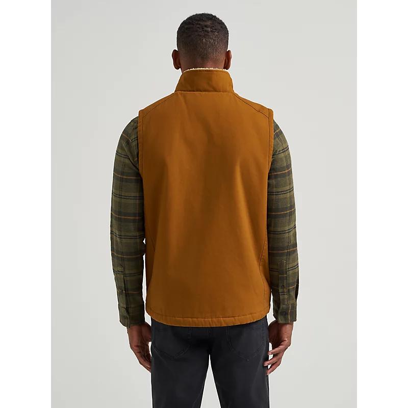 Crafted to beat fluctuating forecasts, this vest combines a classic canvas shell with a durable, comfortable, and warm sherpa lining. It features a zip front with a lined collar, secure zip chest pocket, and slash front pockets for essential storage and cozy hands. Outer: 98% Cotton, 2% Spandex; Inner: 100% Polyester. Tobacco. S.