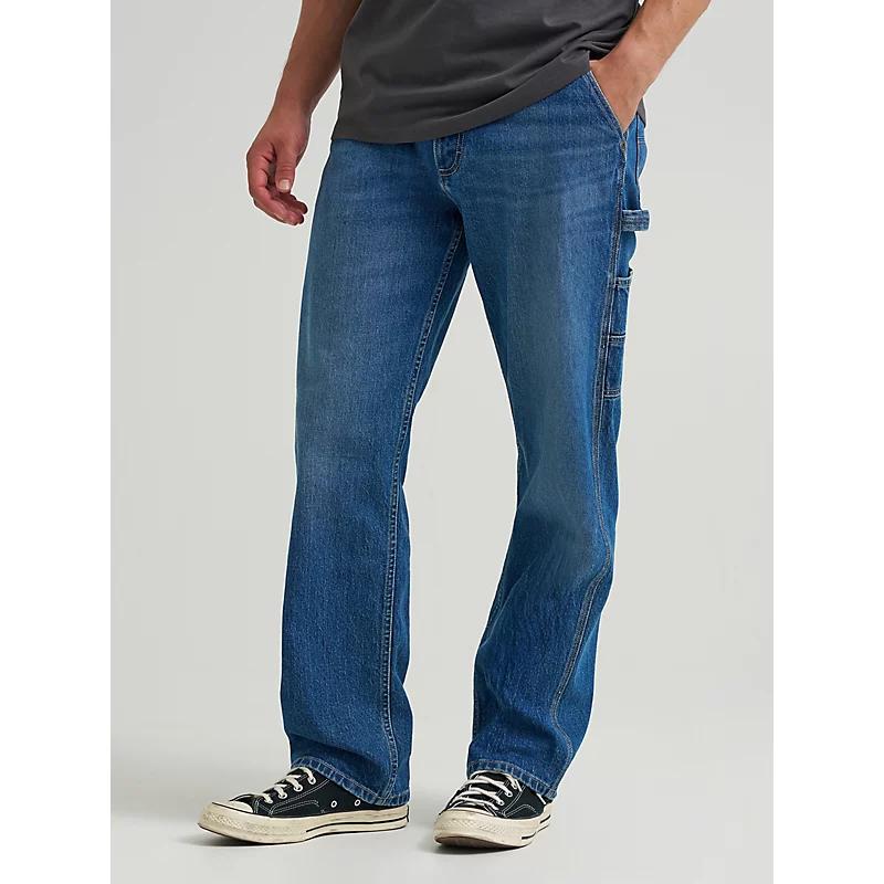 These carpenter jeans are perfect for anyone who wants a loose fit, straight leg silhouette, and timeless workwear style. They feature extra side pockets and a hammer loop, with details like branded hardware and our iconic leather patch convenience and features a classic fit just below the waist with a full, straight leg. 99% Cotton, 1% Elastane. Painter Blue. 29 W / 32 L.