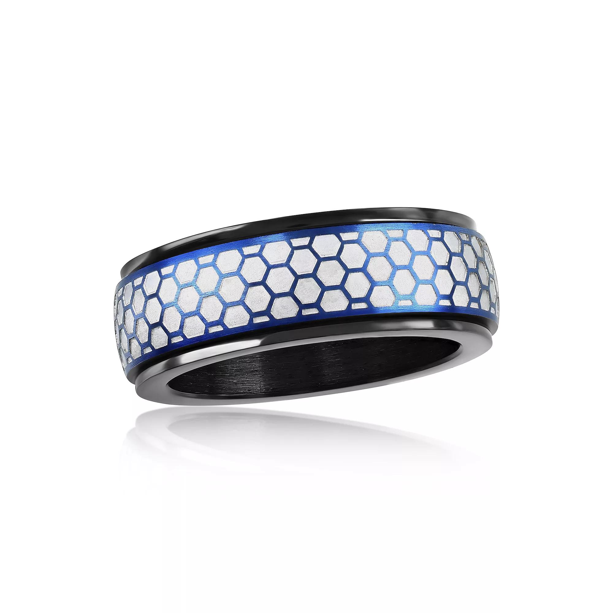 Accent your look with this unique Men's Metallo Black-Plated Stainless Steel Honeycomb Spinner Ring. Click on this JEWELRY & WATCHES GUIDE to learn about fit, styles, materials and more! Accent your look with this unique Men's Metallo Black-Plated Stainless Steel Honeycomb Spinner Ring. Click on this JEWELRY & WATCHES GUIDE to learn about fit, styles, materials and more! FEATURES Width: 8 mm Shank style: band Band fit: rounded Metal: stainless steel Plating: black Finish: polished Packaging: boxed Nickel free Imported Size: 11. Color: Blue Stainless. Gender: male. Age Group: adult.