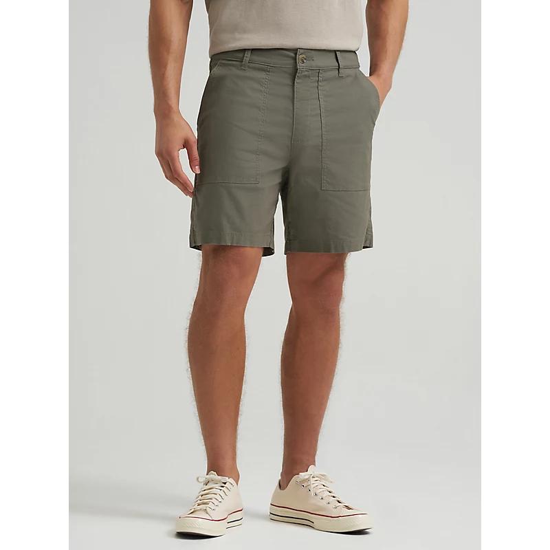 From shop floors to coffee runs, this relaxed utility short knows how to keep the pace. It features a set‑on waistband, utility patch pockets up front, and flap back pockets with button closures and raised stitching. With iconic Lee details and a mid‑length cut for balanced coverage, it’s easy to wear, works hard, and cleans up nicely. 98% Cotton, 2% Elastane. Lichen Olive. 30 W / 8 Inches.
