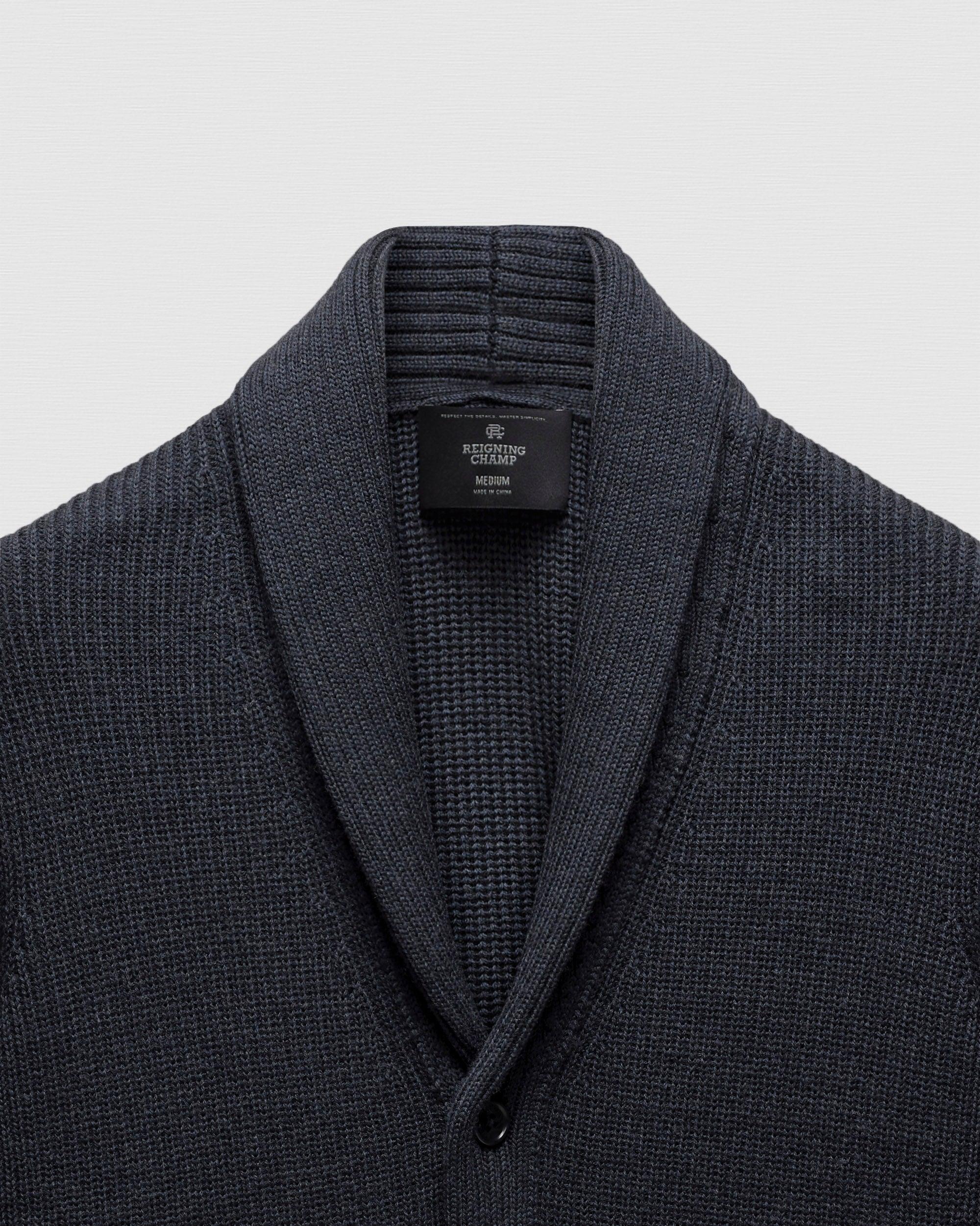 This shawl cardigan is crafted from premium merino wool milled in Italy. Featuring a standard fit, with fully fashioned seam construction. Designed with a rib knit collar and placket, faux horn buttons, semi-raglan sleeves, inset welt pockets, and rib cuffs and hem.