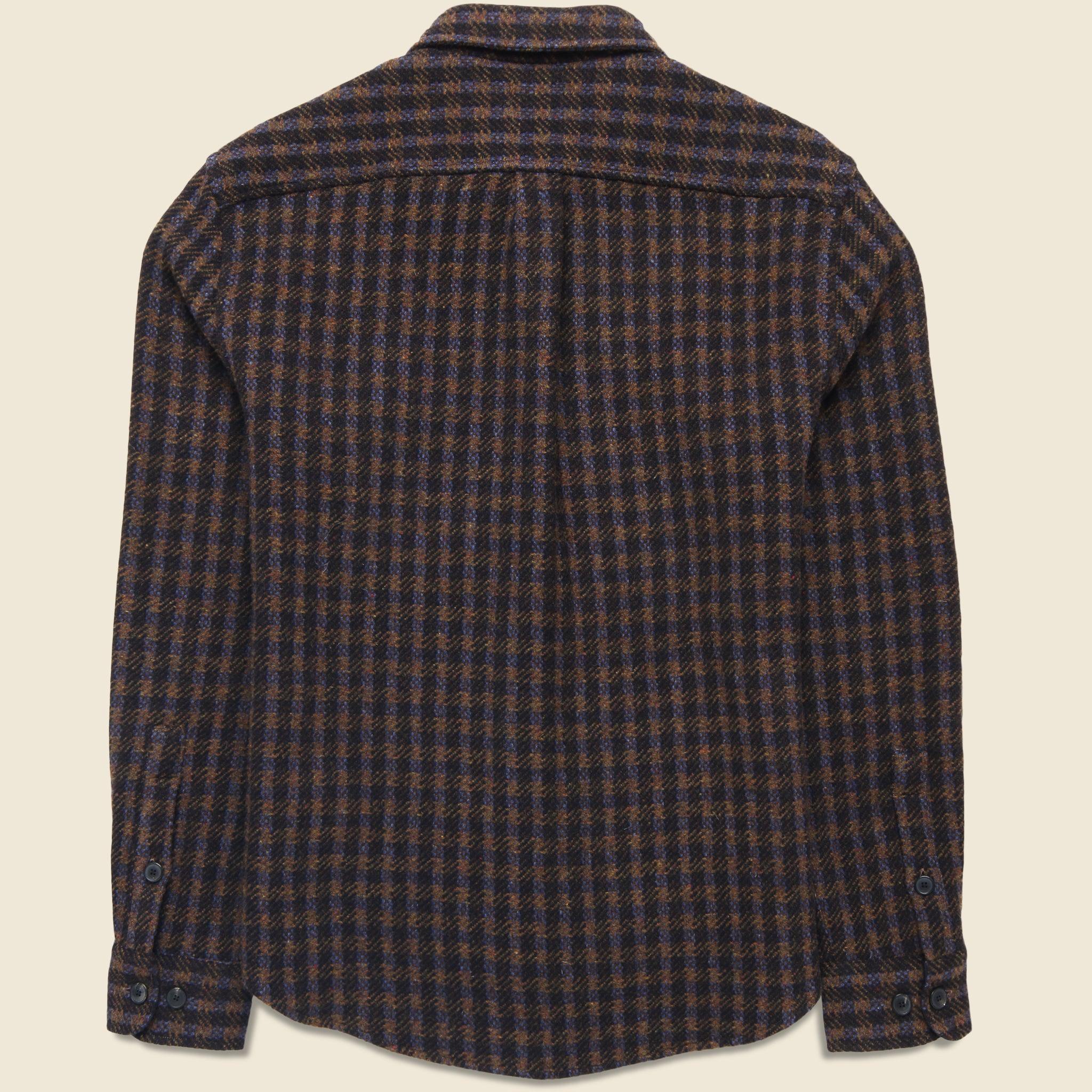 This Overshirt from Portuguese Flannel is expertly crafted from super-soft, midweight Merino wool that's woven with a vintage-inspired tweed pattern and tailored with a perfectly relaxed fit to make it an easy go-to layer. It’s detailed with eco-friendly recycled polyester buttons, a single chest pocket, a spread collar, and a slightly curved hem to round things out. Soft, warm Merino wool Woven tweed pattern Recycled buttons Single chest pocket Spread collar Curved hem Relaxed fit through the chest and shoulder We recommend taking your normal size or taking one size down for a slimmer fit Made in Portugal 100% Merino Wool The following measurements are for size Medium: Chest: 44” | Shoulder: 17” | Sleeve: 33 ½” | Length: 28”