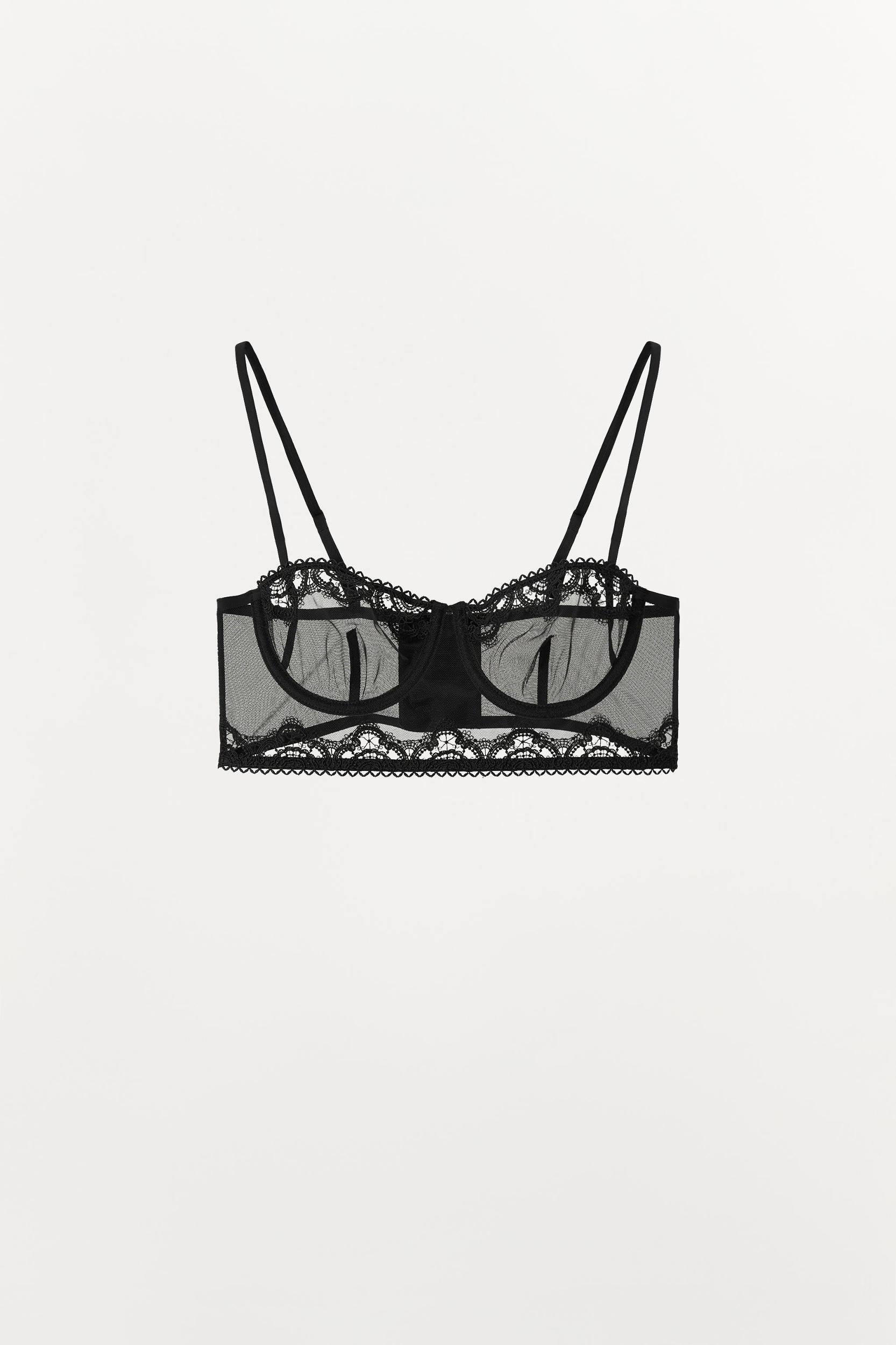 Underwire bra made in mesh fabric. Sweetheart neckline and thin adjustable straps. Matching lace appliqué detail. Back closure with metal hooks.