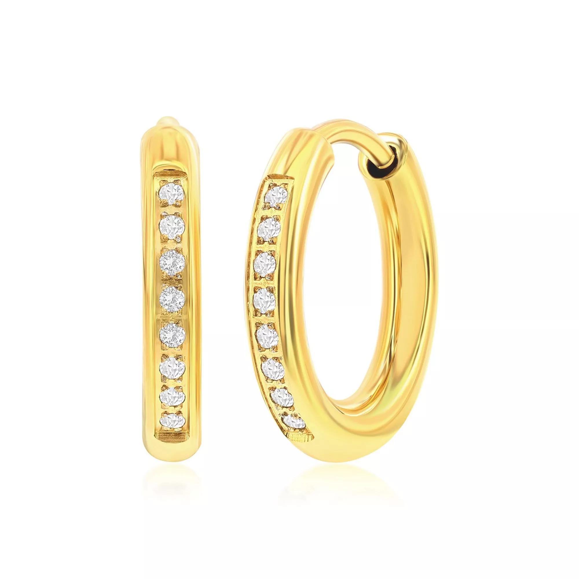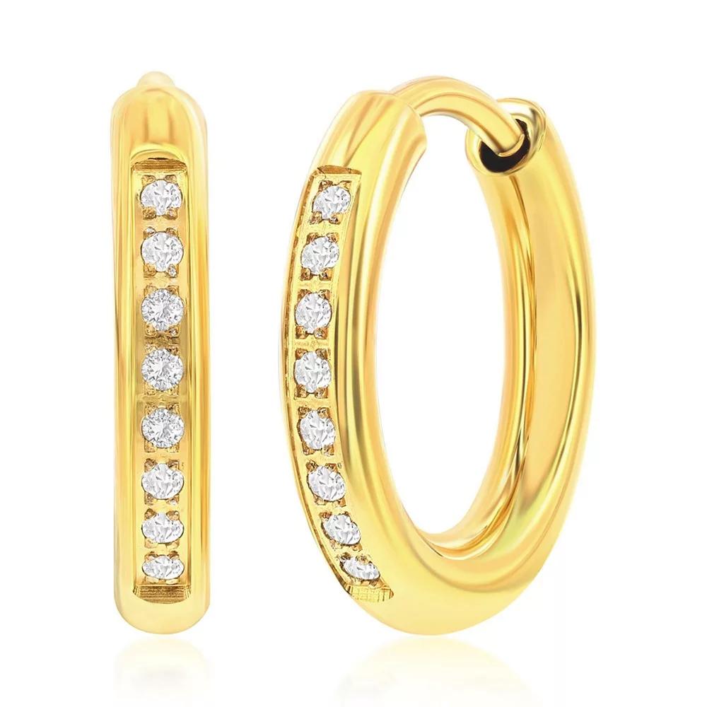 Shine bright with the Metallo 15mm Cubic Zirconia Huggie Hoop Earrings, featuring sparkling stones for a touch of glamour. Click on this JEWELRY & WATCHES GUIDE to learn about fit, styles, materials and more! Shine bright with the Metallo 15mm Cubic Zirconia Huggie Hoop Earrings, featuring sparkling stones for a touch of glamour. Click on this JEWELRY & WATCHES GUIDE to learn about fit, styles, materials and more! FEATURES Earring dimensions: 15mm Backings: click-it Nickel free Metal: stainless steel Plating: rhodium Finish: polished Packaging: pouch ImportedSTONE DETAILS Stone type: cubic zirconia Center stone size: 1mm Shape: round Setting: bezel Gemstones may have been treated to enhance their appearance. Special care may be required. Please visit our Gemstone Treatment & Special Care Guide for more information. Size: One Size. Color: Gold Tone. Gender: male. Age Group: adult.
