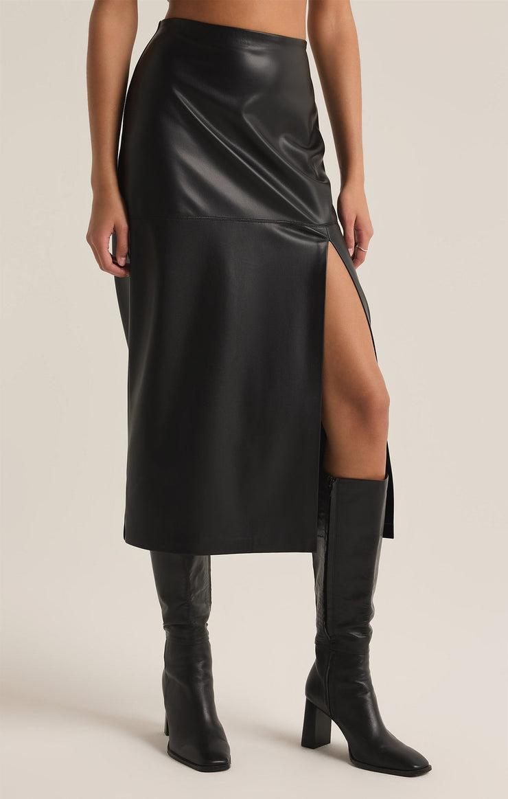 Step out in style with this midrise leather skirt, crafted from our exclusive Butter Touch Faux Leather for a luxe, buttery feel and suede-like interior. The midi length and high front slit add a touch of drama, making it perfect for pairing with a tucked-in sweater or blouse.