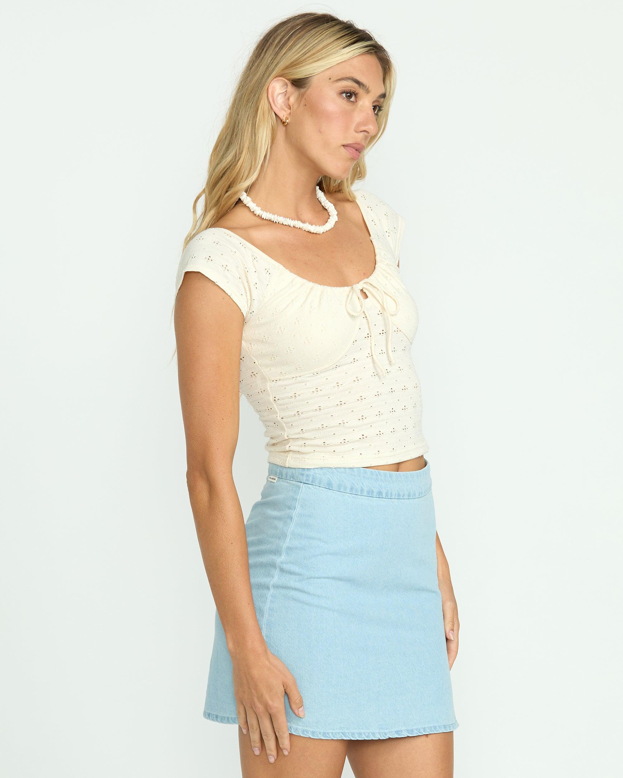 Our lightweight Mia tie-front top is a sheer delight. Featuring a soft cotton knit and eyelet pattern, the perfect pick for sunny days. A smocked back panel pairs with a fitted silhouette, tie-front scoop neck, and cap sleeves for relaxed elegance. Features 78% Cotton 22% Polyester Knit Eyelet Knit top Fitted scoop neck, shirred bodice with adjustable tie Cap sleeve with encased elastic, smocked back panel Metal plate