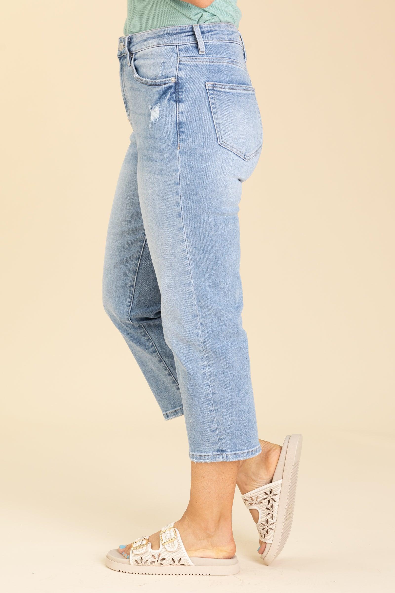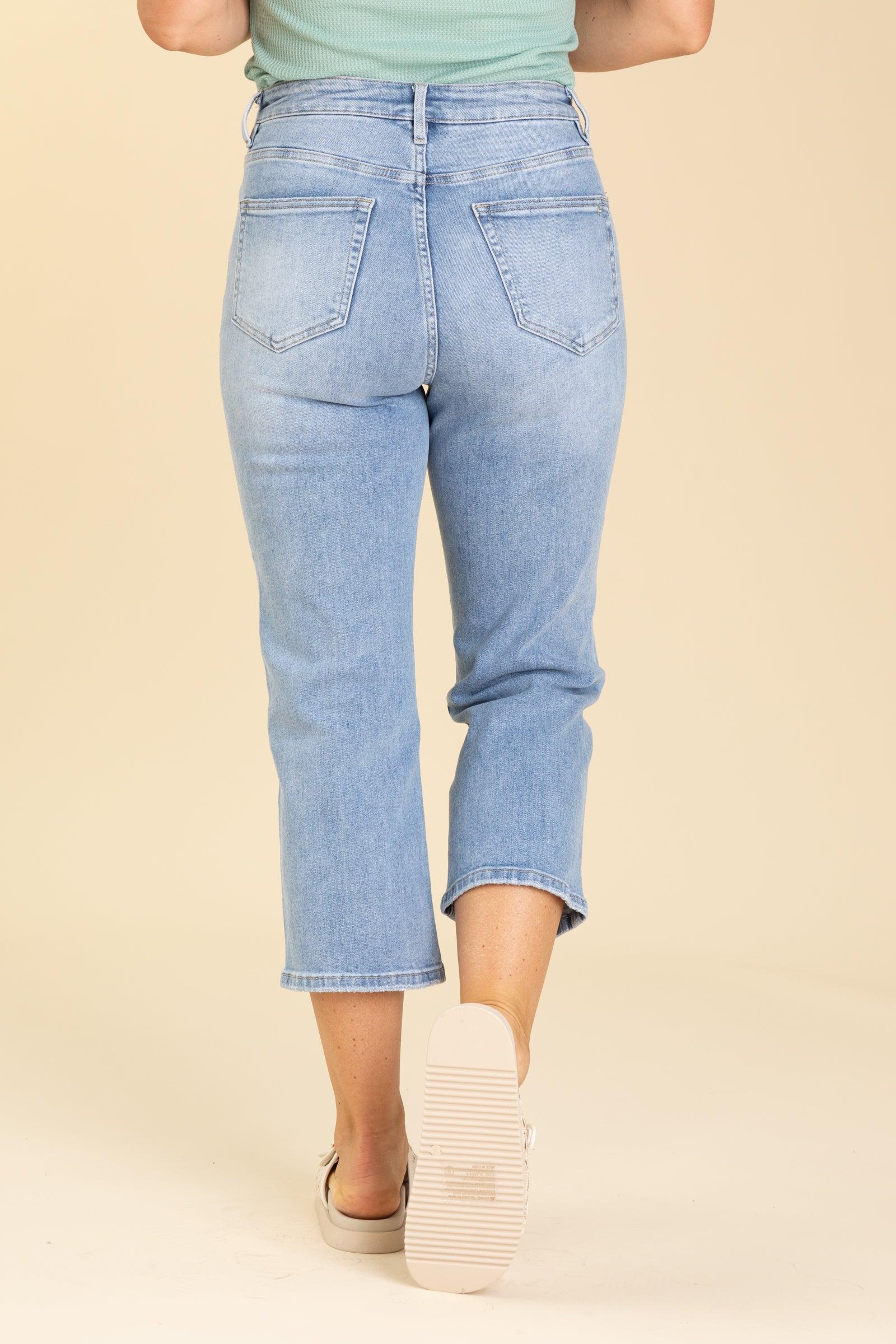 Product Details Color/Wash: Light Wash Rise: High Rise Style: Straight Capri Brand: Mica Material and Care 92.5% Cotton 5.5% Polyester 2% Spandex Machine Wash Cold Tumble Dry Low Size and Fit 24/0 Rise 10.5" Inseam 23.5" 25/1 Rise 10.5" Inseam 23.5" 26/3 Rise 11" Inseam 23.5" 27/5 Rise 11" Inseam 23.5" 28/7 Rise 11.5" Inseam 23.5" 29/9 Rise 12" Inseam 23.5" 30/11 Rise 12.5" Inseam 23.5" 31/13 Rise 12.5" Inseam 23.5" 32/15 Rise 13" Inseam 23.5" Erica is 5’7” and wearing her true size medium