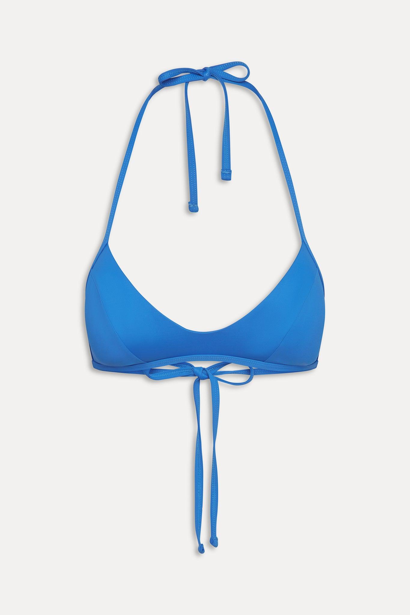 Designed with sculpting seams and a plunging front, this bikini top offers everything you're looking for. Details Padded cups with removable inserts Adjustable halter neck and back ties Skimpy coverage Moderate support Designed in a new shade of Lake Blue Signature soft swim fabric