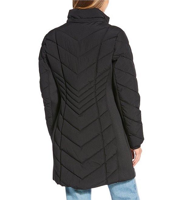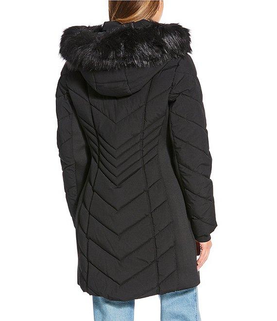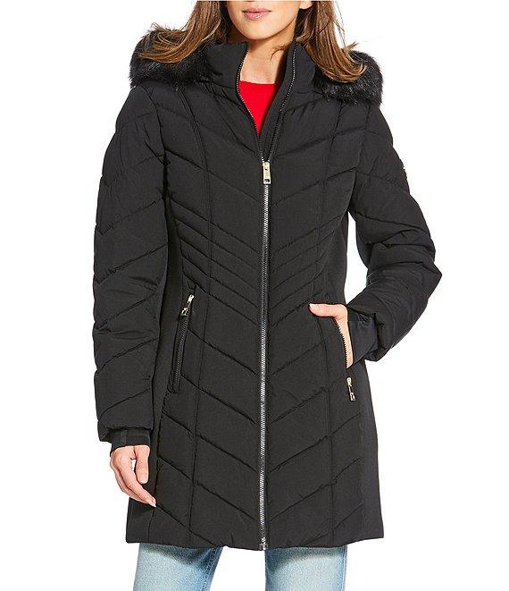 From MICHAEL Michael Kors, this jacket features: Quilted fabrication Puffer silhouette Stand collar neckline Removable hooded Long sleeves with cuff knit Under sleeve panel Front zip pockets Faux fur trim Polyester fill Mid weight Fitted Fully lined Straight hemline Zip front closure Approx. 34" length Polyester/spandex; lining: polyester Machine wash Imported.