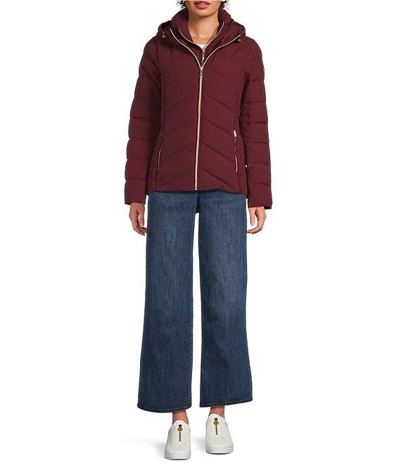 From MICHAEL Michael Kors, this jacket features: Quilted fabrication Puffer silhouette Stand collar neckline Attached hooded Long sleeves Front zip pockets Recycled polyester fill Water resistant Mid weight Fitted fit Fully lined Straight hemline Front zip closure Approx. 26" length Polyester; lining: nylon Machine wash Imported.