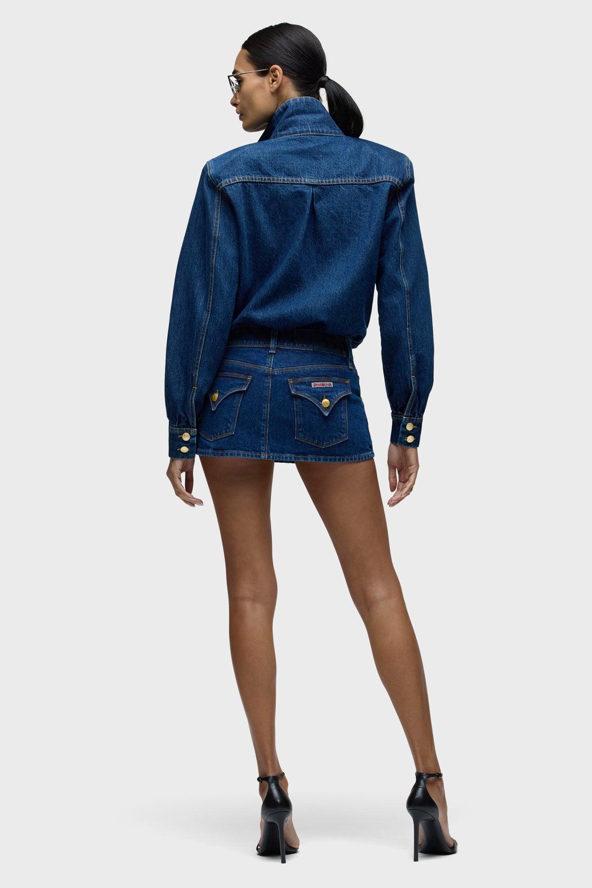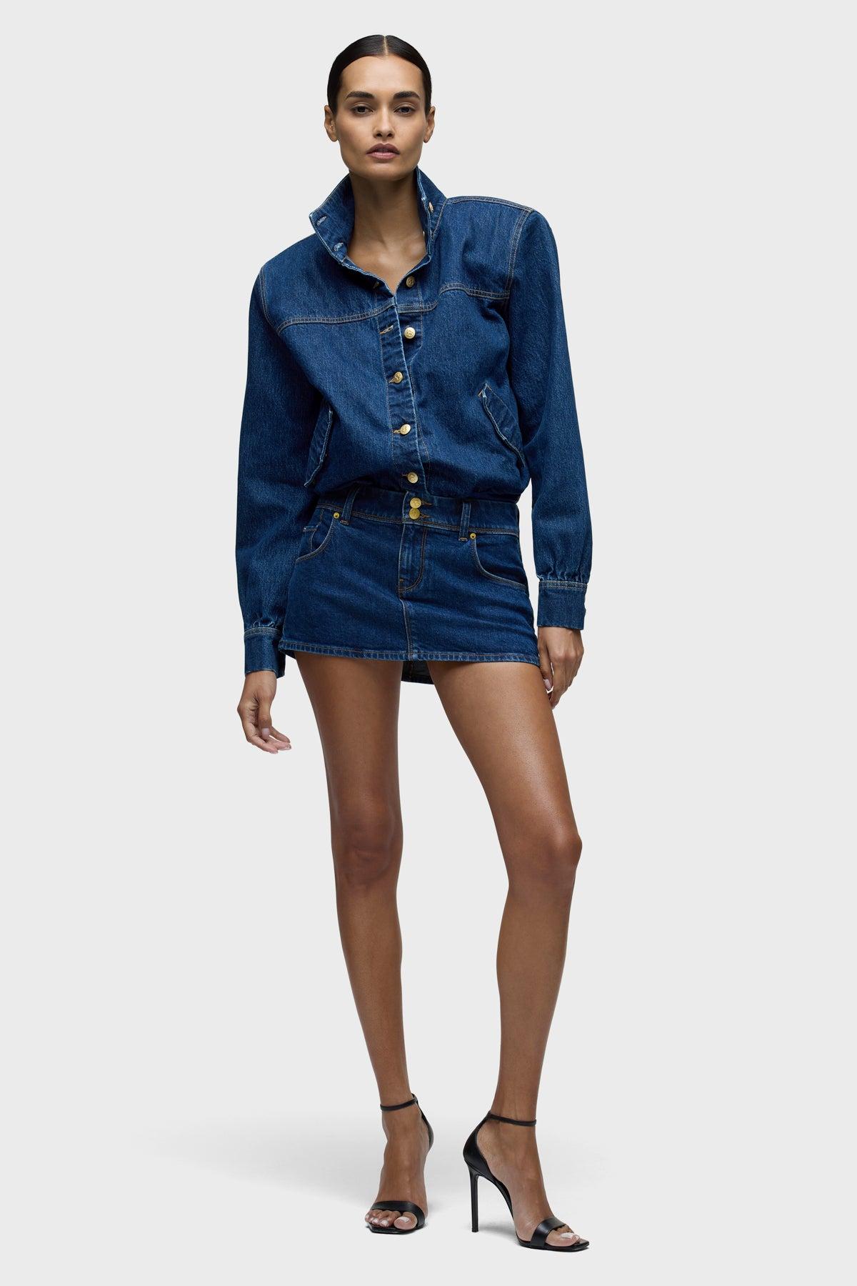 Description Part of our Brooks Nader collab capsule, the Micreaux Mini Skirt in Front Street is a nod to our roots, as this mini skirt features our original flap pockets with a double button at the waistband and our Union Jack flag label. To elevate the look, we added gold branded buttons and a branded leather patch to the back waistband. This skirt is made of a comfort stretch denim in a medium dark indigo wash with stone washing. It pairs great with the Beaucoup Bodysuit, or it can be worn by itself. This capsule was curated by model Brooks Nader and features her personal closet must-haves. Product Details CF Length: 11", CB Length: 12", Sweep: 40"Model Height 5'9"Model wearing size 25Measurements based on size 27 Fit & Care Content: 98% Cotton, 2% ElastaneMachine wash cold with like colorsDo not bleachTumble dry low or hang to dry