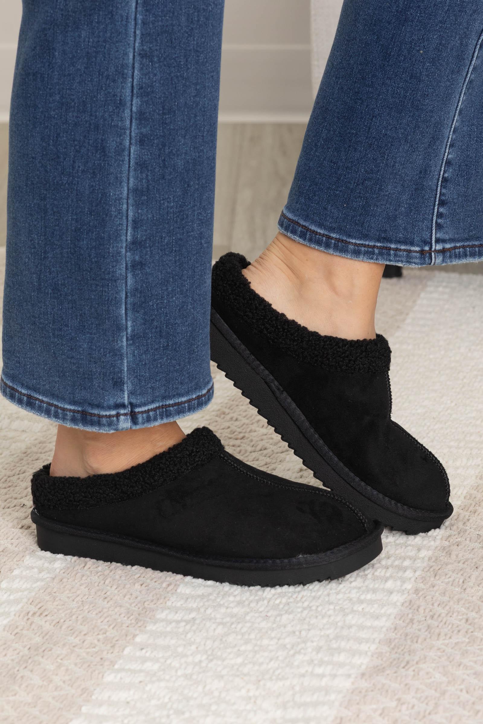 Style: Slip On Slipper Brand: SODA Colors: Black/ Tan, Ivory Print: Solid w/Fleece Interior: Sherpa Lined Our Team Size Recommendation: We recommend true to size.