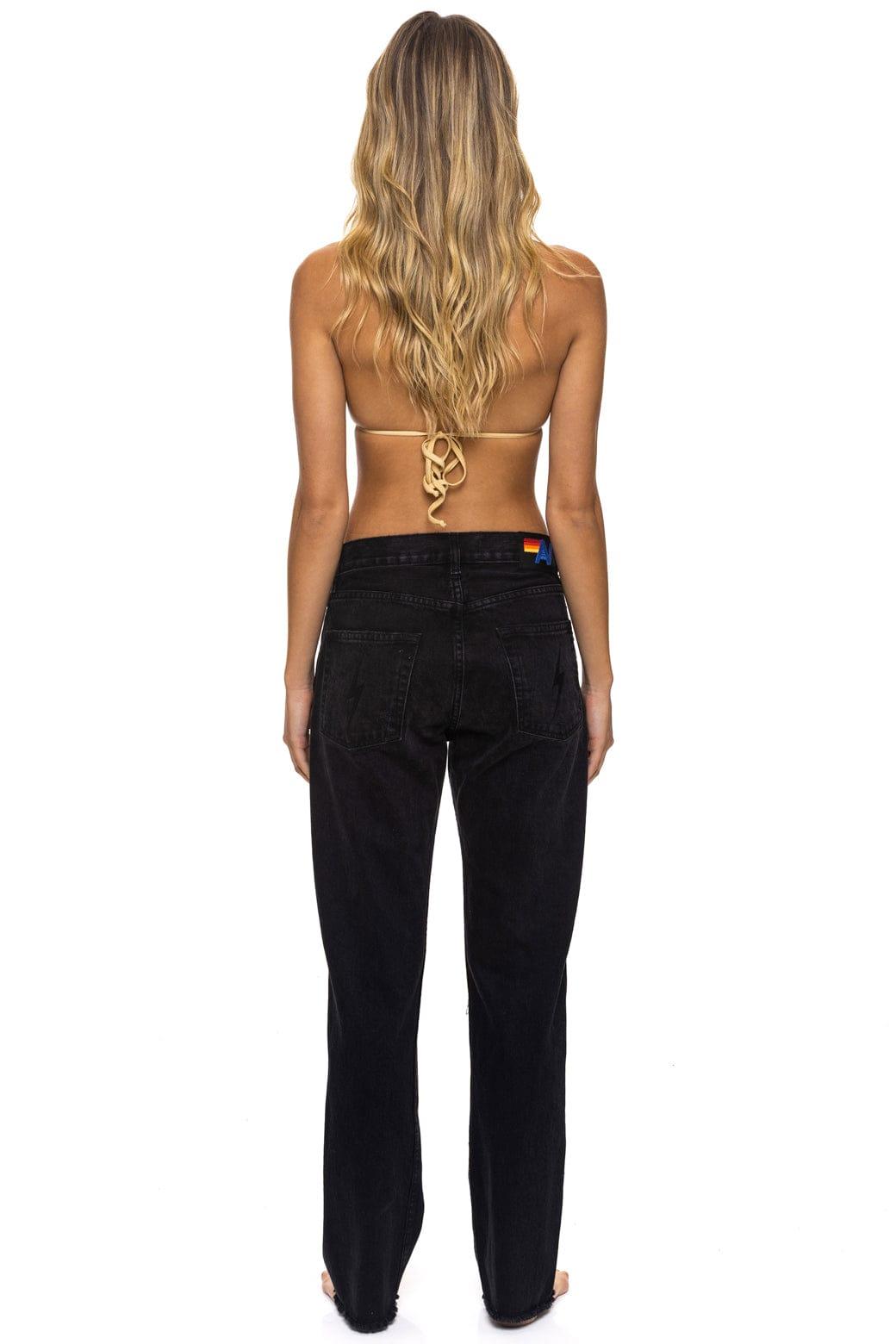 This is the perfect relaxed straight leg fit with a mid rise and ankle-length inseam. Cut from superior soft semi-rigid denim with added laundering to give that perfect broken in feel with fading, ripped knees, and distressed details. Special laundered wash process to give it our personal vintage feel. - 100% Organic Cotton Denim - Handmade in LA with imported materials -Model is wearing a size 25 Measurements: Front Rise - 11 3/4 inches Inseam - 28 inches Leg Opening - 16 1/2 inches