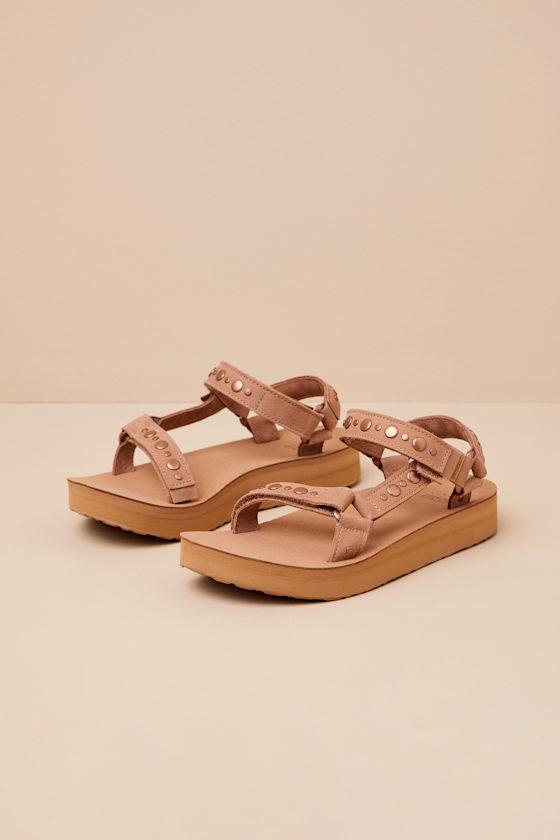 With a lil' extra shine and a genuine leather upper, these must-have summer sandals by Teva complete so many casually cool OOTDs. The adjustable VELCRO® toe strap leads to a matching quarter strap, both adorned with eye-catching studded details. An on-trend flatform foam sole completes the elevated design. Logo tag accents outstep strap. Available in whole sizes only.