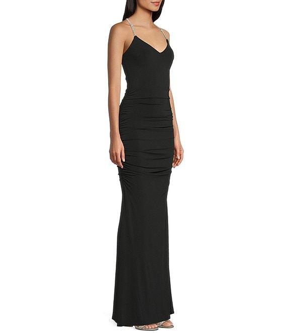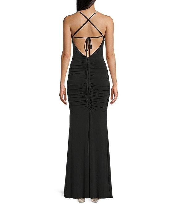From Midnight Doll, this dress features: V-neckline Sleeveless Rhinestone-embellished knotted straps Crisscross lace-up back Long skirt Slim fitting 63" length from center-back neck Self of polyester/spandex; lining of polyester; lined Hand wash/line dry Imported.