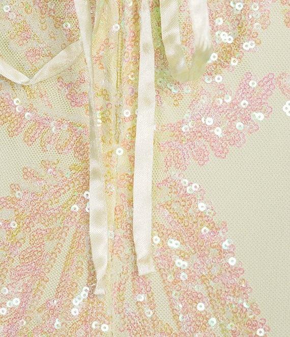From Midnight Doll, this dress features: Sequin-patterned fabric Scoop neckline Sleeveless Spaghetti straps Front side slit Zip back and tie closure 65" center back length Polyester/spandex; lined Hand wash/lay flat to dry Imported.