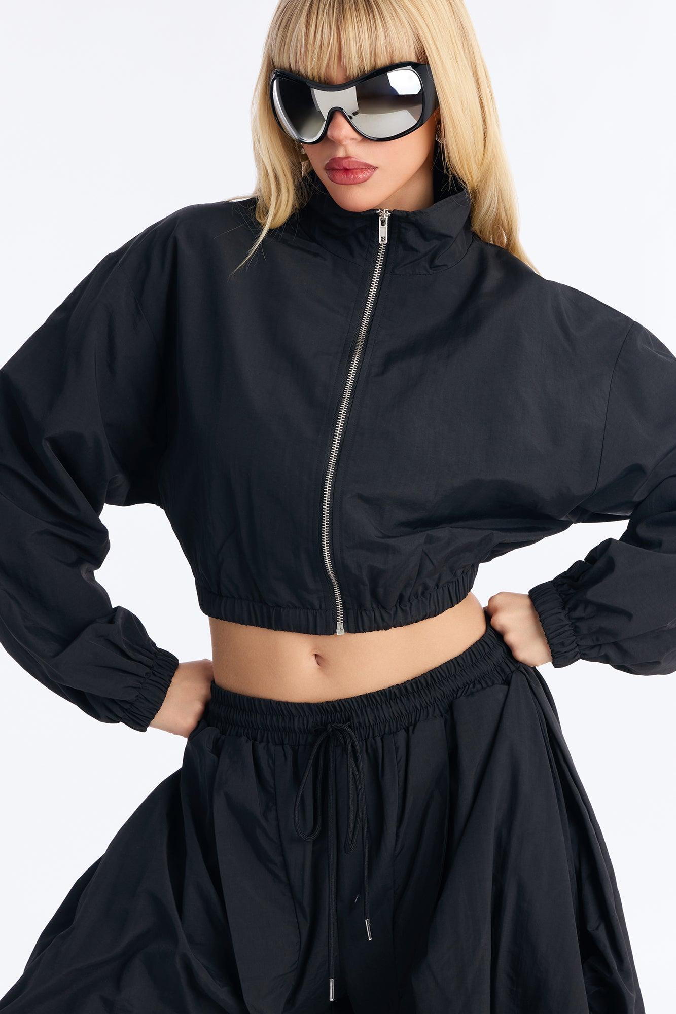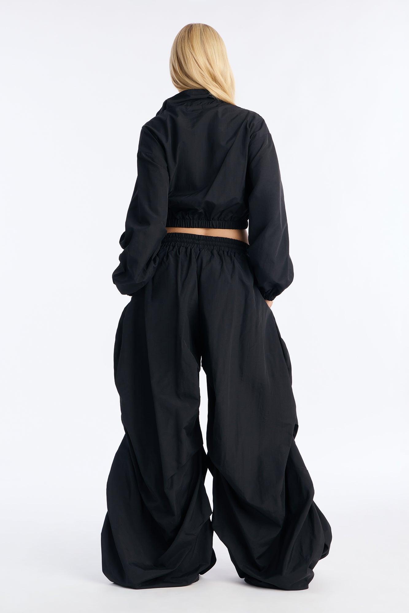 Available In Black And Olive. Jacket And Adjustable Wide Leg Pant Set 2 Piece Ensemble Moderate Stretch 32" Inseam Elastic Drawstring Waistband Adjustable Ankle Toggles Pockets Jacket & Pants Self: 100% Nylon Jacket: Lining: 100% Polyester Imported California Proposition 65WARNING: Cancer and Reproductive Harm - www.P65Warnings.ca.gov.