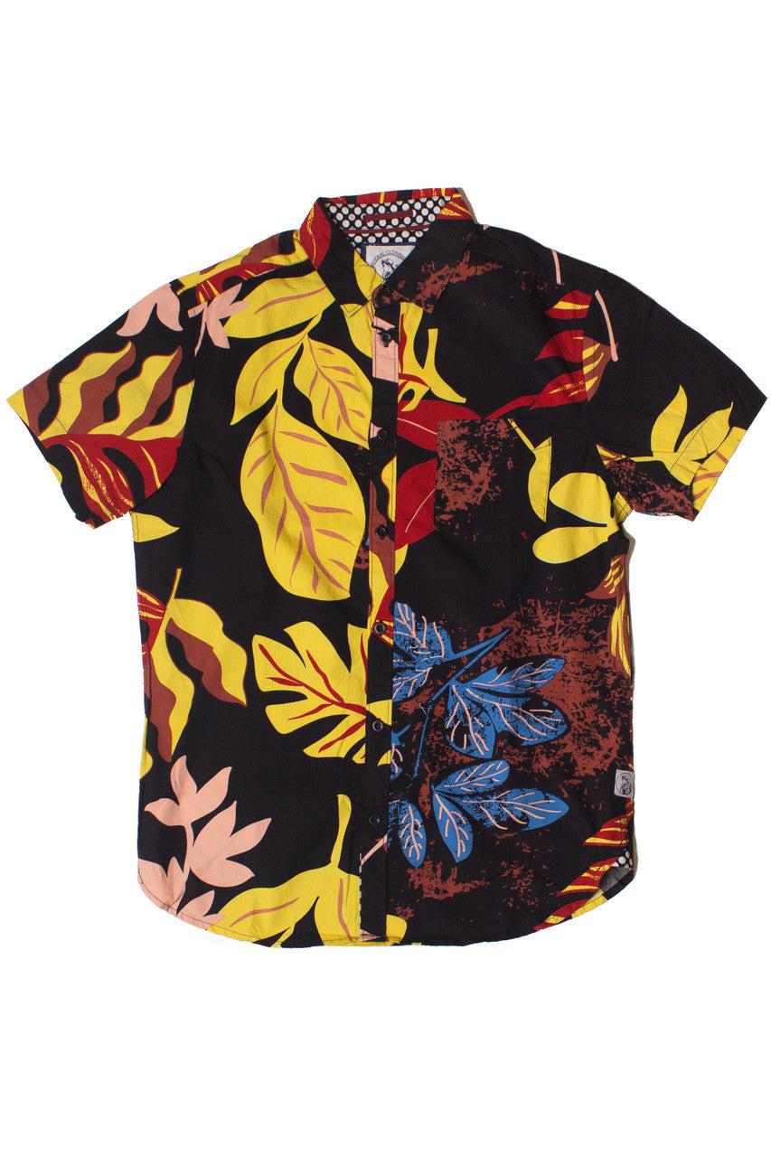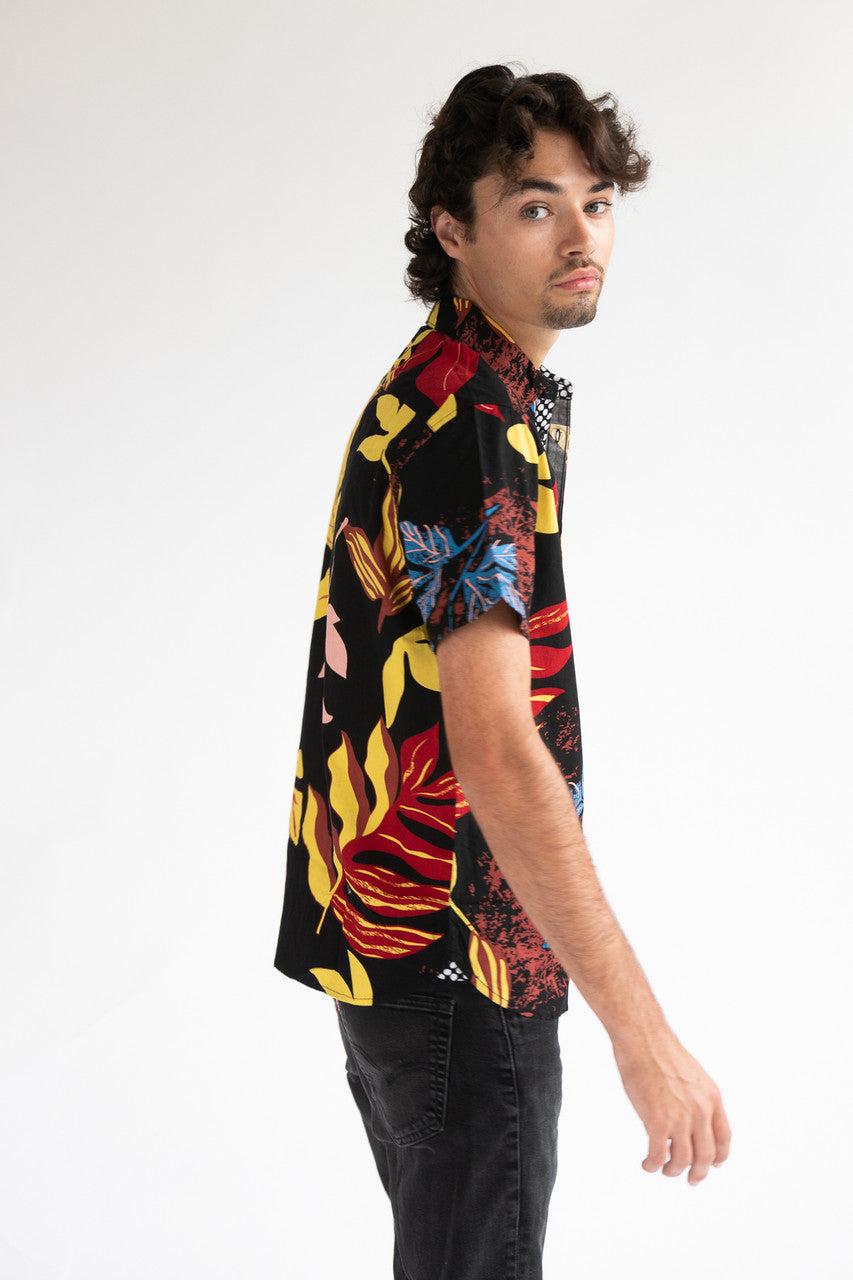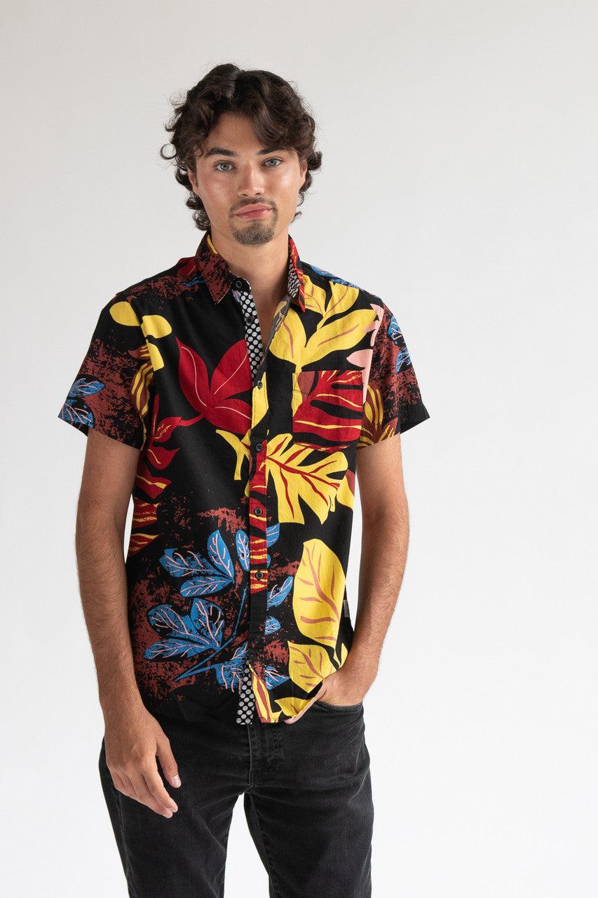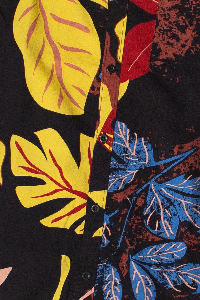 Linen Blend Tropical Print Casual Shirt - Black Multi