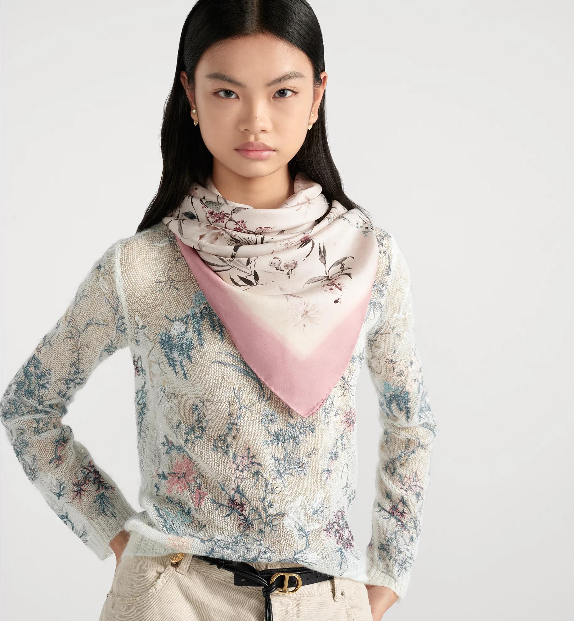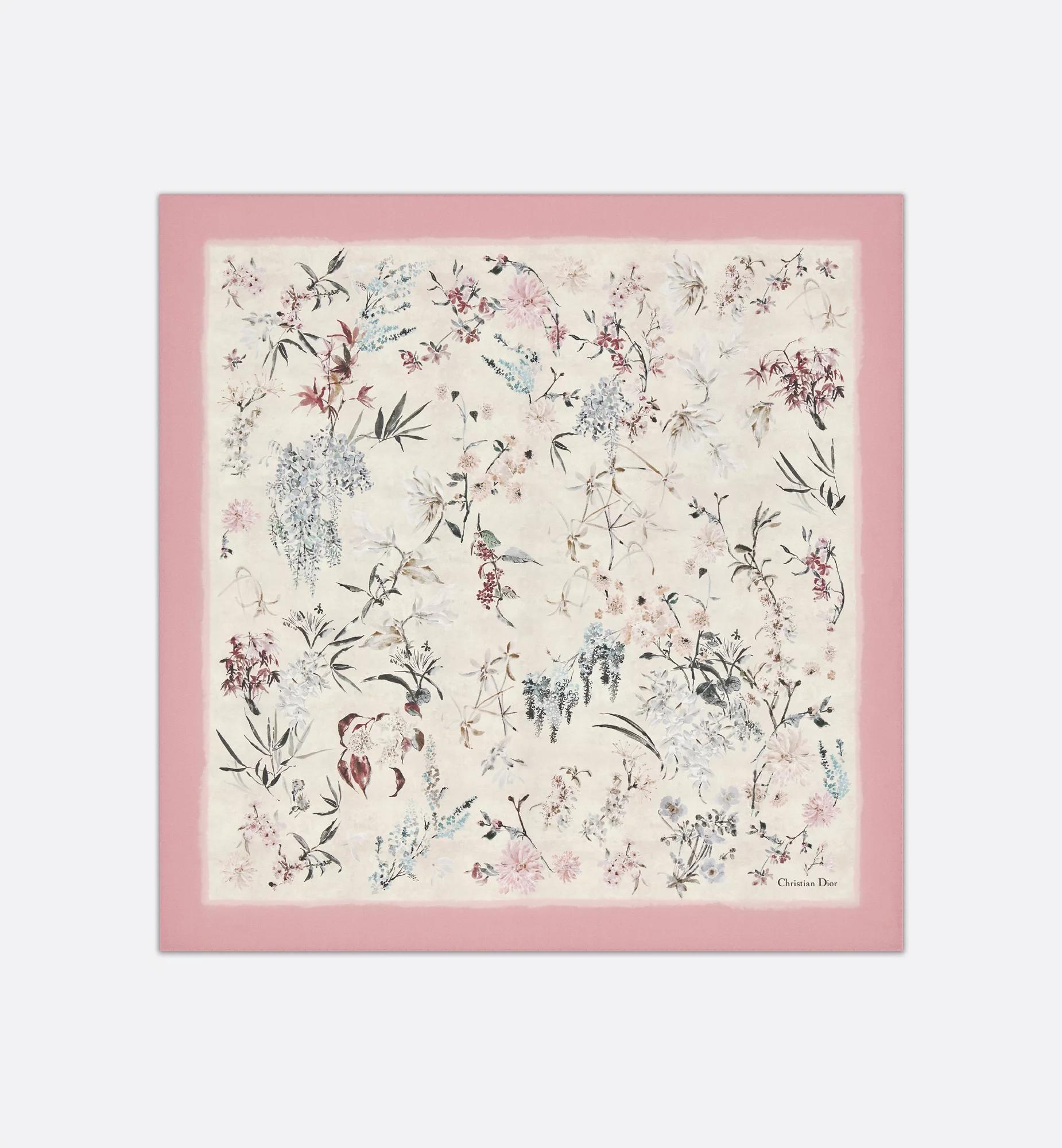 The square scarf showcases the multicolor Millefiori print, presenting a refined collection of Asian flowers in soft, delicate hues. Crafted in ivory silk twill, the double-sided style features contrasting pink hand-rolled edges and the Christian Dior signature. The square scarf can be worn tied around the neck or at the head to complete a Dior look. Pink multicolor double-sided Millefiori print. Christian Dior signature. Contrasting hand-rolled edges. 100% silk twill. Made in Italy