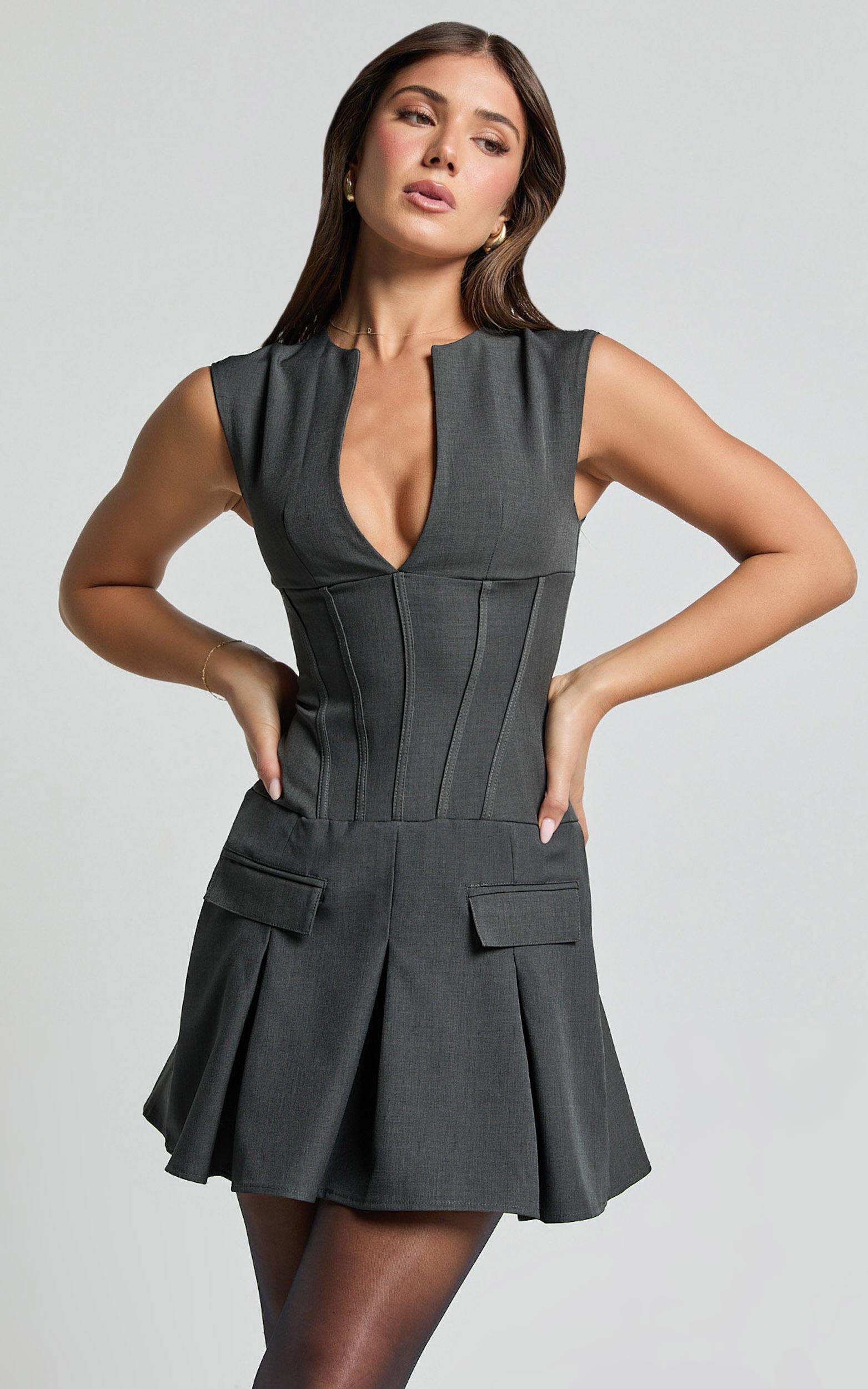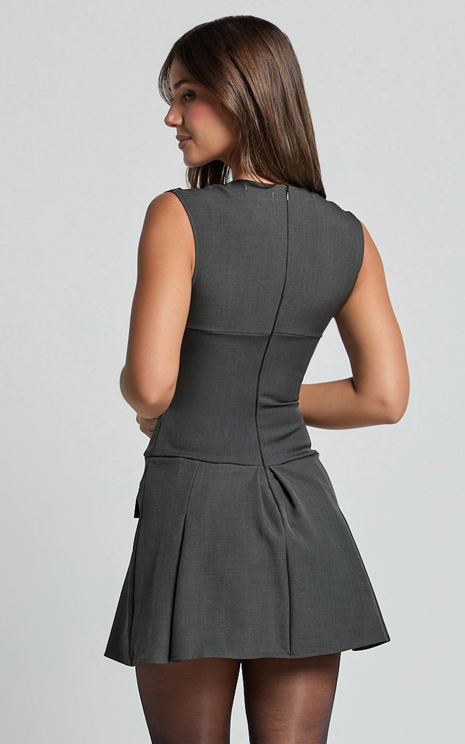 Transform your look with the Mindy Mini Dress, a plunge neck pocket detail tailored dress in a sleek charcoal gray that guarantees to make a statement wherever you go. Crafted from a mid-weight woven polyester, this fitted dress combines comfort with a chic edge, perfect for the fashion-forward woman looking for versatility in her wardrobe.Product Details:Fitted dressMid Weight WovenPlunge necklineWorkwear appropriateMini lengthSleevelessPolyester fabricMaterial and Care100% PolyesterLow / No stretch