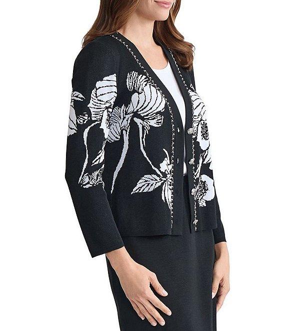 Ming Wang Floral Jacquard V-Neck Long Sleeve Chain Trim Cardigan