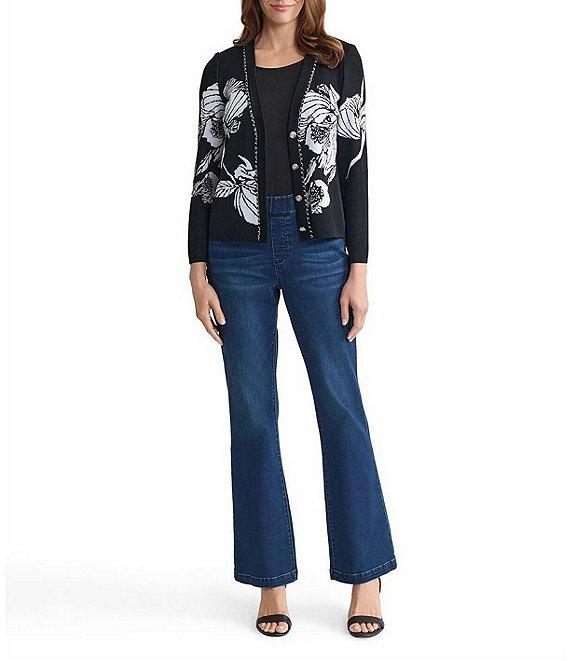 From Ming Wang, this cardigan features: Floral jacquard fabrication V-neckline Long sleeves Chain trim Straight hem Button front closure Approx. 23" length Acrylic/polyester Hand wash Imported.