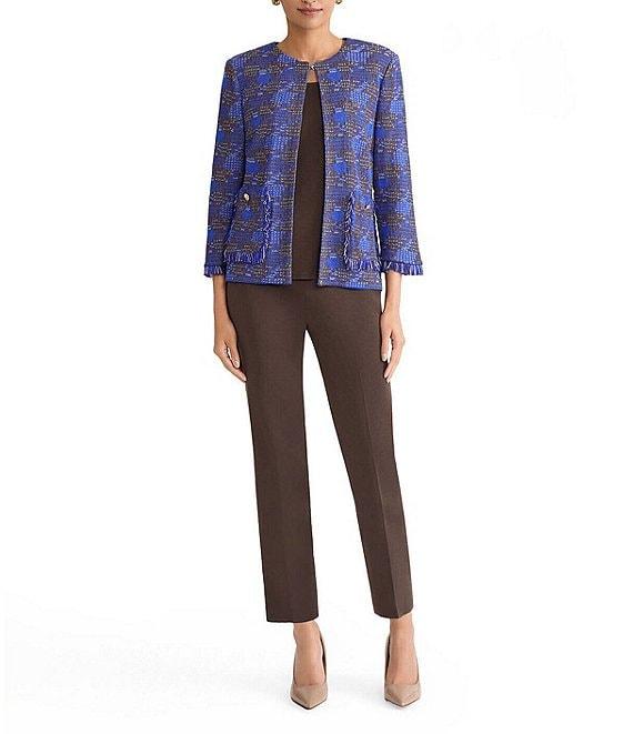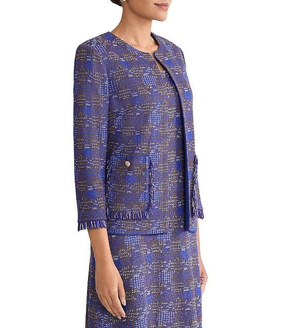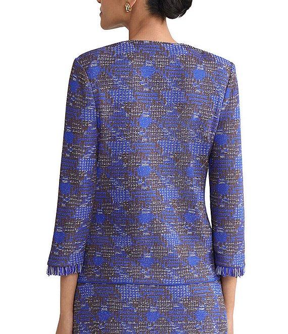 From Ming Wang, this jacket features: Tweed knit fabrication Heritage fit Round neckline Bracelet sleeves Soft shoulder pads Front patch pockets Fringe trim Straight hem Hook front closure Approx. 23" length Acrylic/nylon/rayon Hand wash Imported.