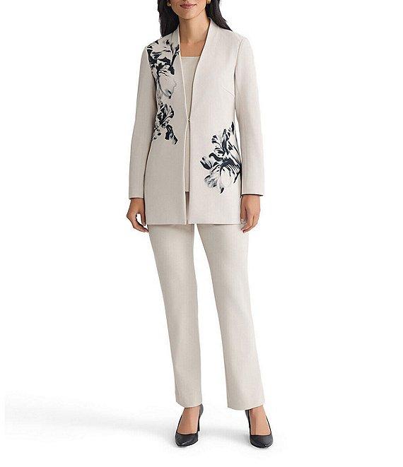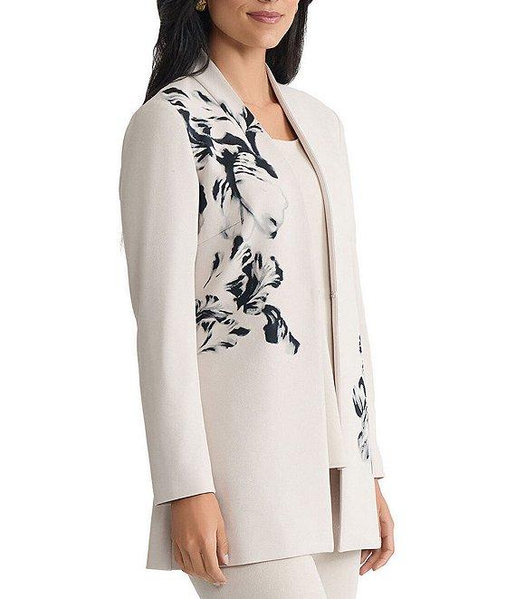 From Ming Wang, this jacket features: Stretch deco crepe fabrication Floral placement print Modified mandarin v-neckline Long sleeves Straight hem Hook front closure Approx. 32" length Polyester/spandex; lining: polyester/spandex Hand wash Imported.