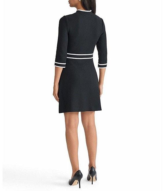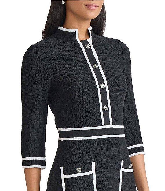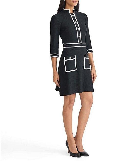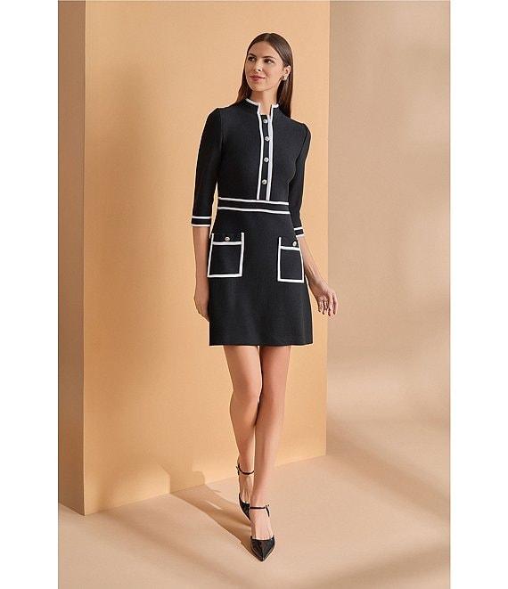 From Ming Wang, this dress features: Knit fabrication Utility styling Stand collar neckline 3/4 sleeves Front patch pockets with button detail Straight hem Button front closure Pullover construction Approx. 36" length Acrylic/nylon Machine wash/tumble dry Imported.