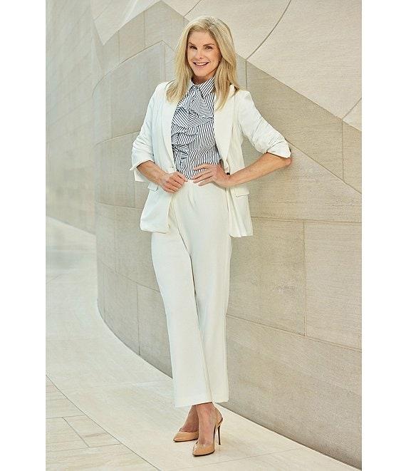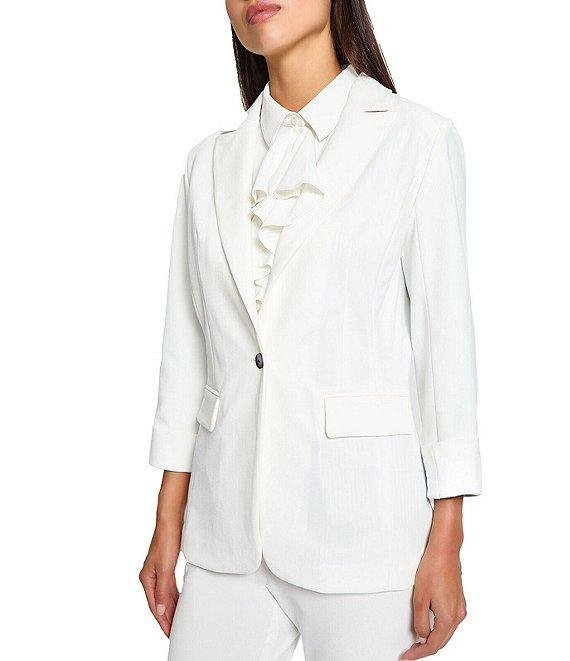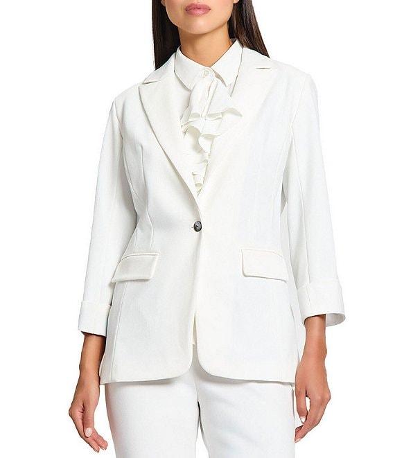 From Ming Wang x Tanya Foster, this blazer features: Deco crepe fabrication Notch lapel neckline Bracelet sleeves Front flap pockets Straight hem Waist darts One-button closure Approx. 28" length Polyester/spandex; lining: polyester Machine wash/tumble dry Imported.