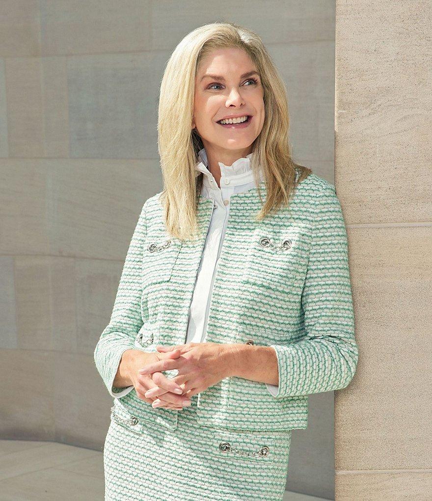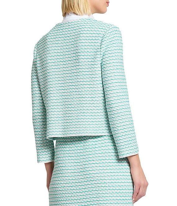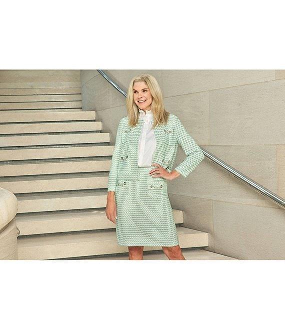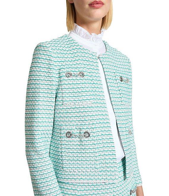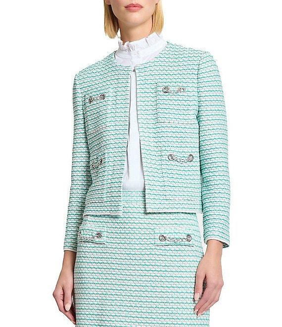 From Ming Wang x Tanya Foster, this blazer features: Stitch knit fabrication Wrinkle-resistant Round neckline Long sleeves Shoulder pads Chain trim patch pockets Heritage fit Straight hem Hook neck closure Approx. 20" length Rayon/polyester/acrylic Hand wash Imported.