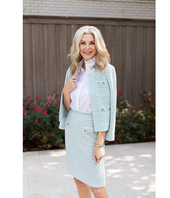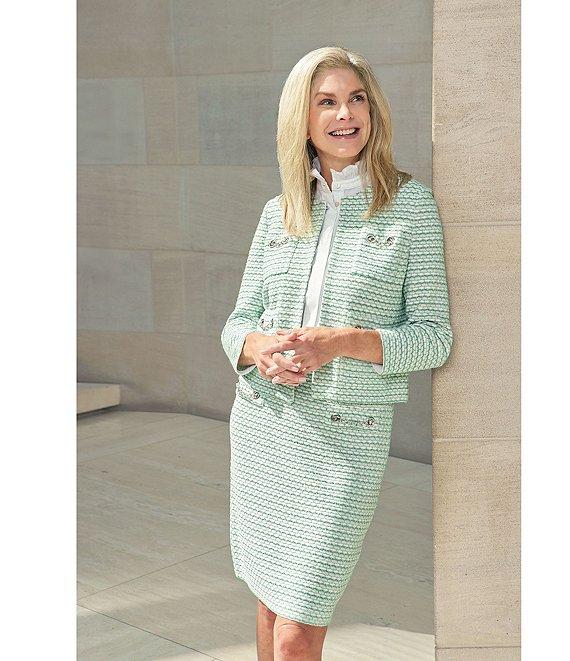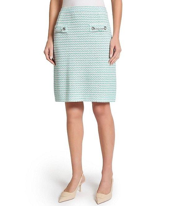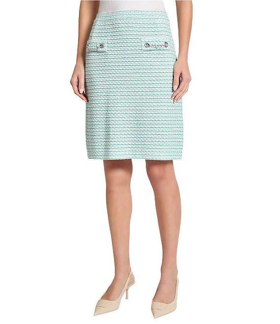 From Ming Wang x Tanya Foster, this skirt features: Textured stitch knit fabrication Elastic waistband Winkle-resistant Faux pockets with chain trim Straight hem Pull-on construction Approx. 22" length Rayon/polyester/acrylic Hand wash Imported.