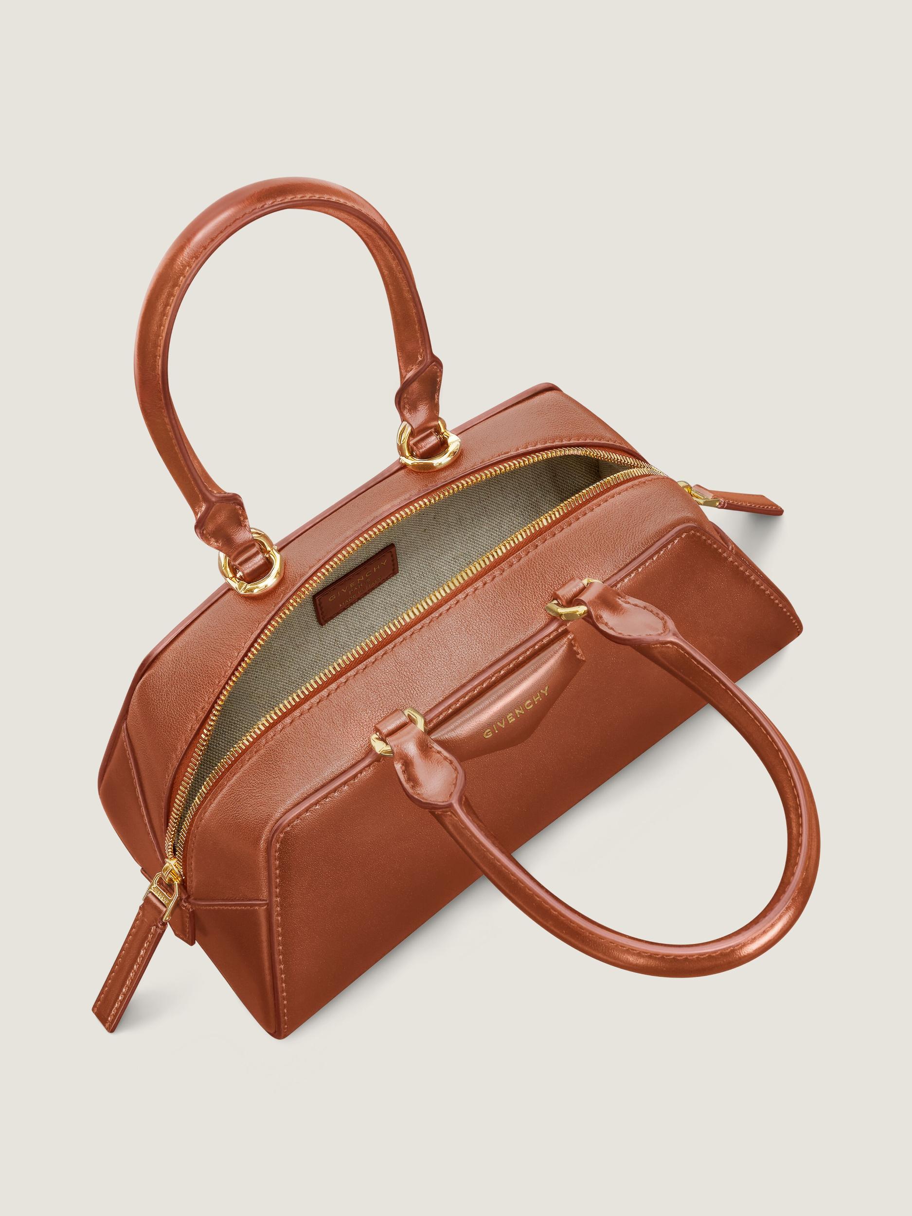 Mini bag in Box calfskin leather and shiny grained leather. Antigona line. Long East-West shape with origami-style gusset construction. Zipped closure. Hand or crossbody carrying. Articulated leather handles with four D-Rings for the shoulder strap. Adjustable and removable leather shoulder strap. Pentagonal patch with embossed GIVENCHY signature on the front. GIVENCHY Paris patch on the inside. Golden-finish metal details. One main compartment.